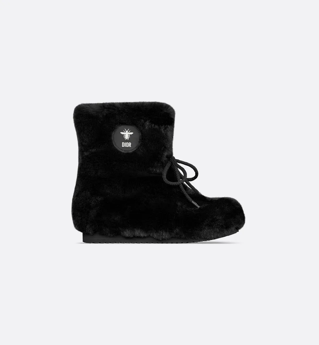Faux fur ankle boot in black with a dior bee patch. Features a lace-up closure for easy wear.