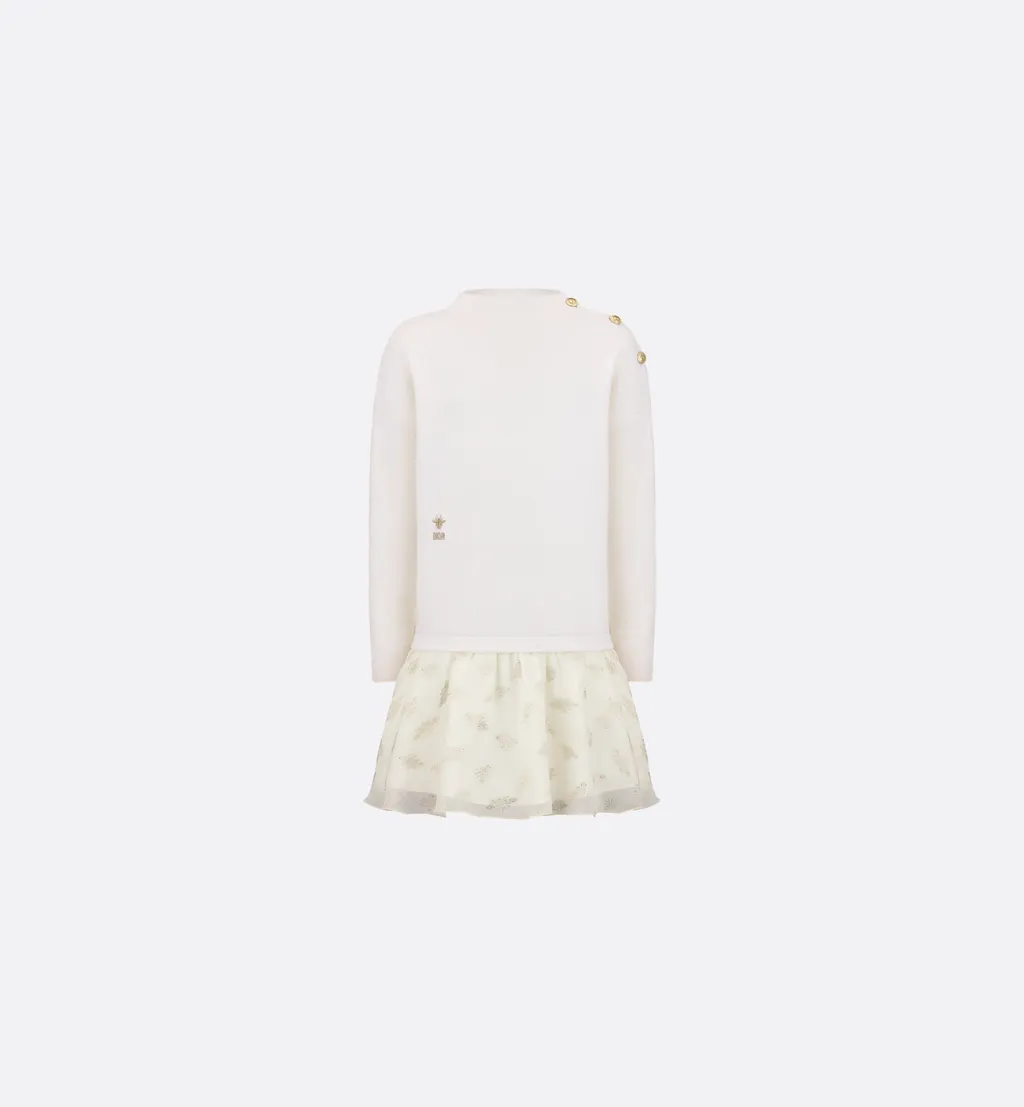 DescriptionThis ivory wool punto milano knit dress features an ethereal chiffon skirt with gold-tone jacquard bees. It has a slightly raised neckline and pale gold-finish metal buttons on the shoulder. A dior bee embroidery in gold-tone metallic thread adorns the waist.