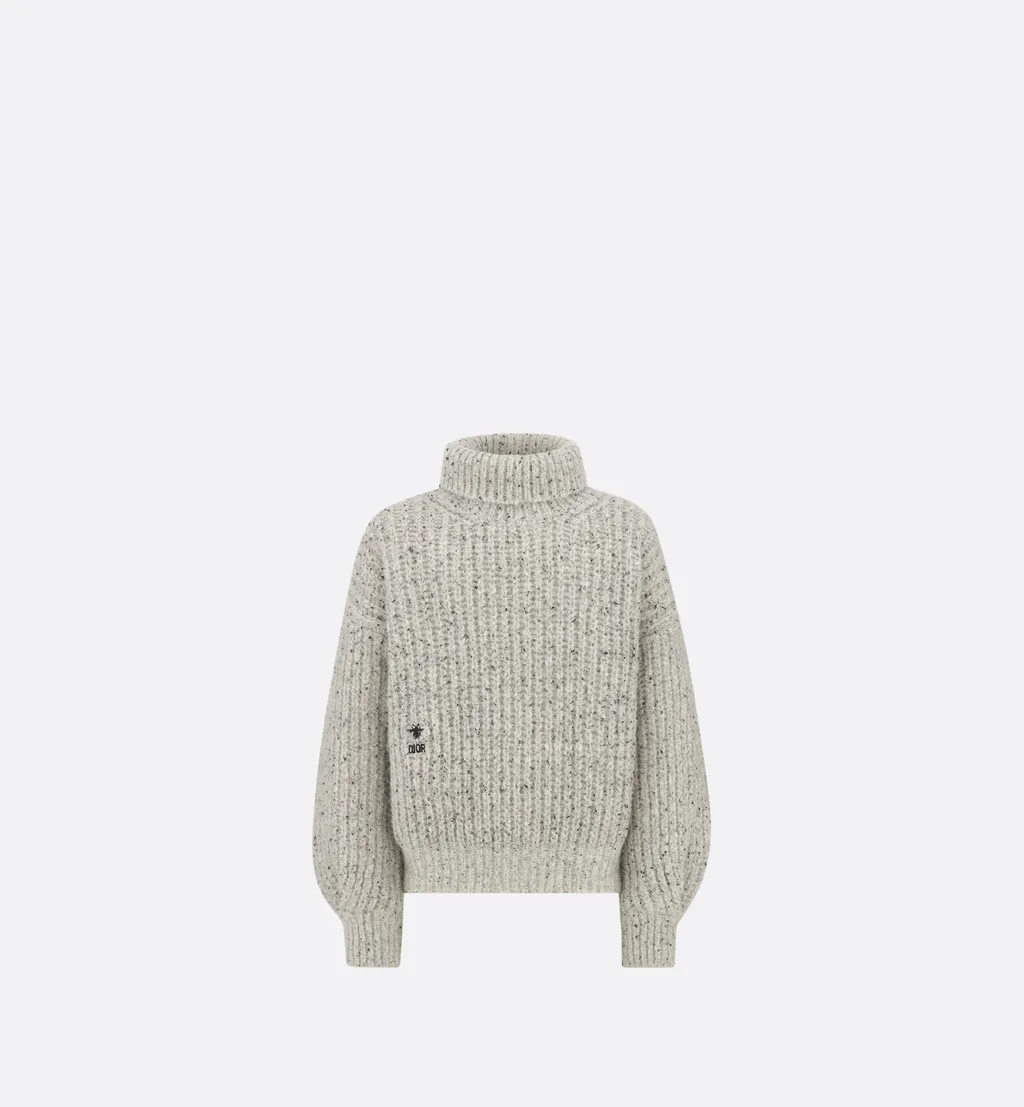 Alpaca-wool mouliné knit sweater with a loose-fitting silhouette, cinched at the hem and cuffs. Features a mock neck and ribbed edges. Adorned with a black dior bee embroidery.