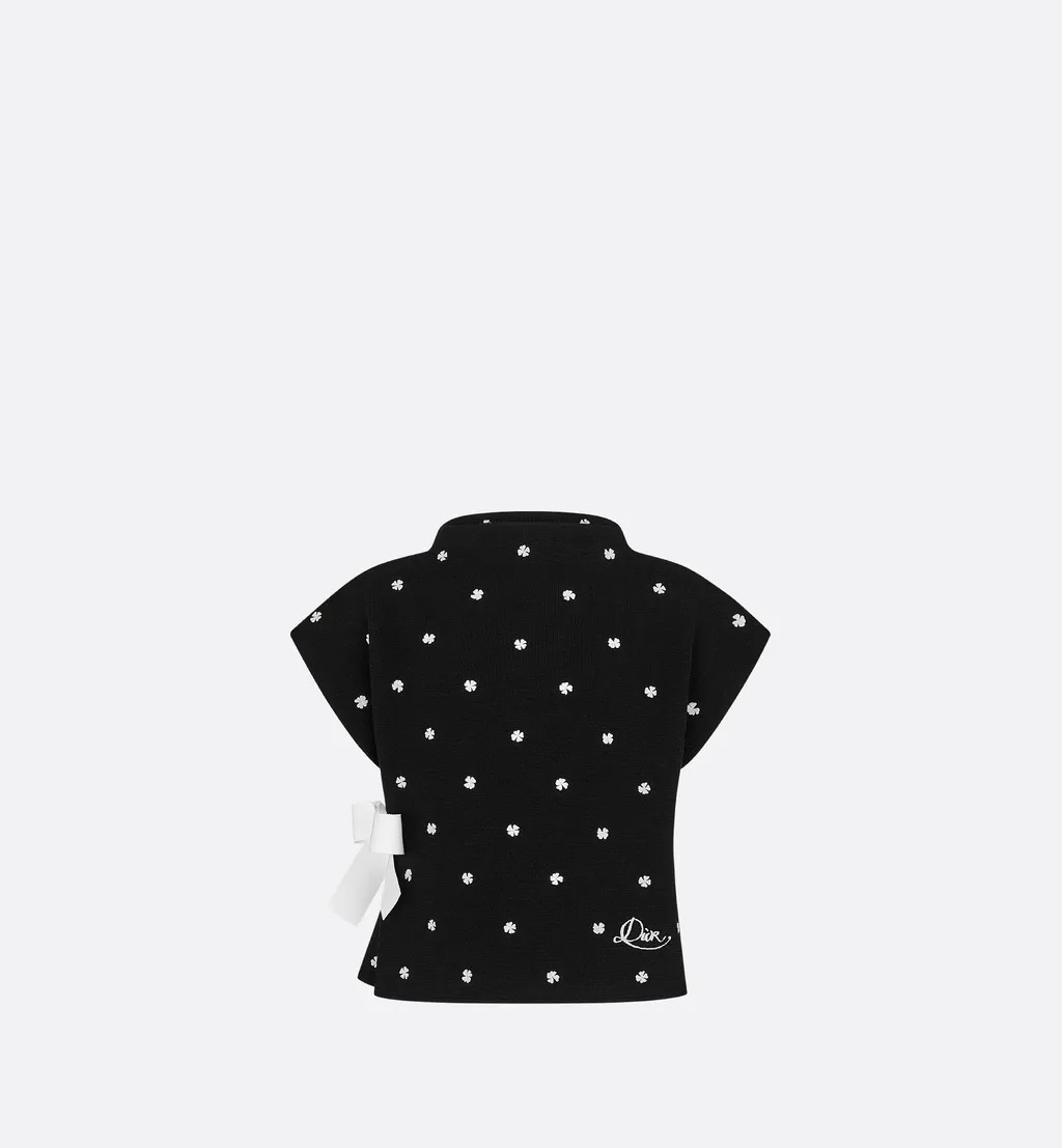 DescriptionThis kids' sweater vest is crafted from black punto milano wool knit with ivory clover embroidery and a grosgrain bow. It features a regular fit, sleeveless design, and a slightly raised collar. The style is embellished with dior ribbon embroidery at the hem.