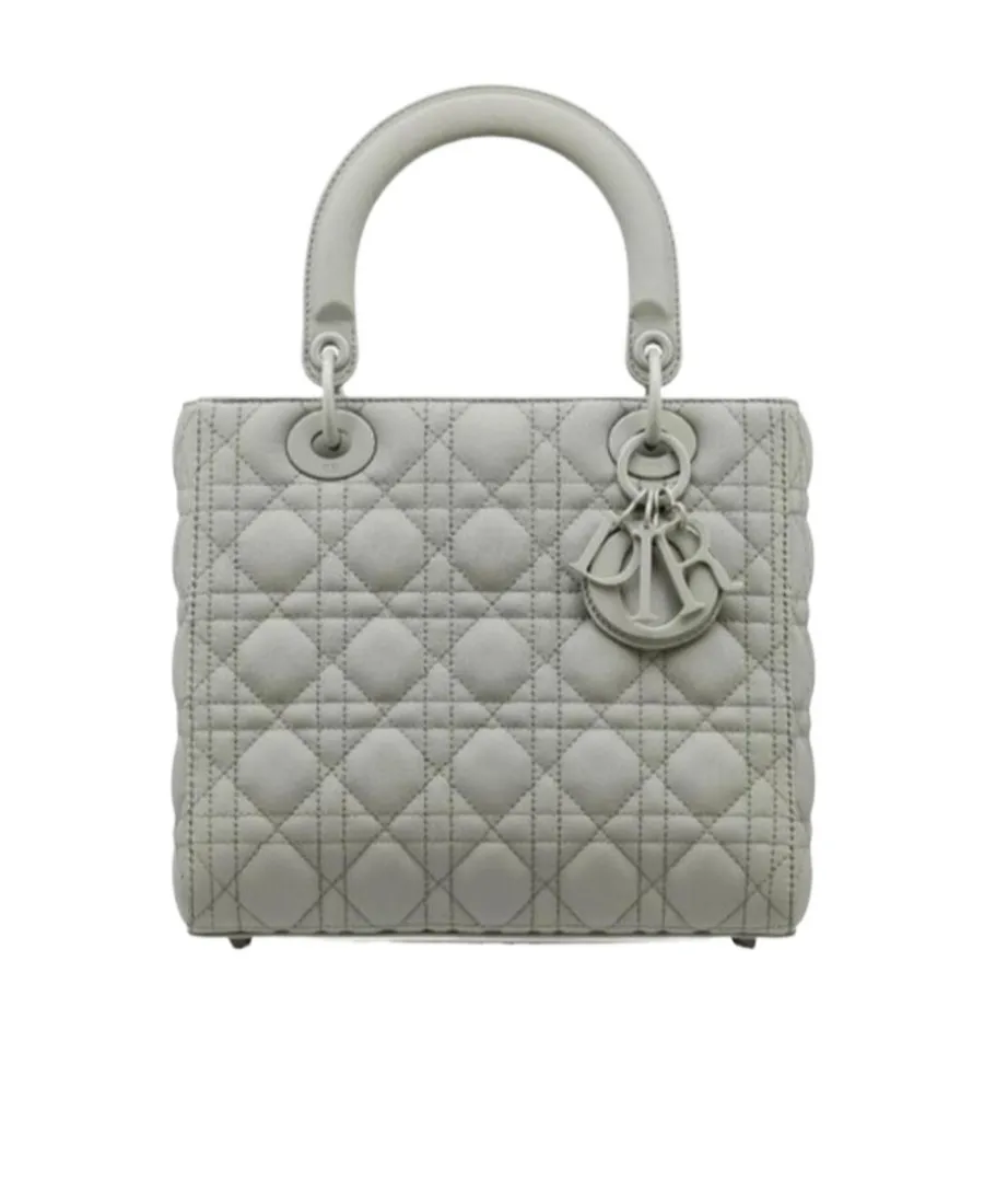 DescriptionMedium lady dior handbag in gray matte cowhide leather with rattan plaid five-frame decoration and iconic metal "d.i.o.r." pendant. Features a removable thin leather shoulder strap for versatile carrying options (hand, shoulder, or crossbody).
