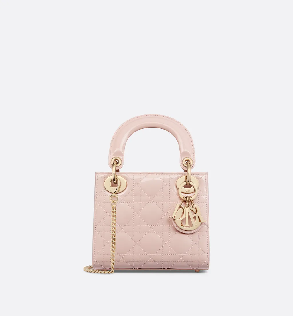 A miniature handbag crafted from patent leather with the iconic cannage motif. Features a top handle, a detachable chain strap, and signature dior charms.