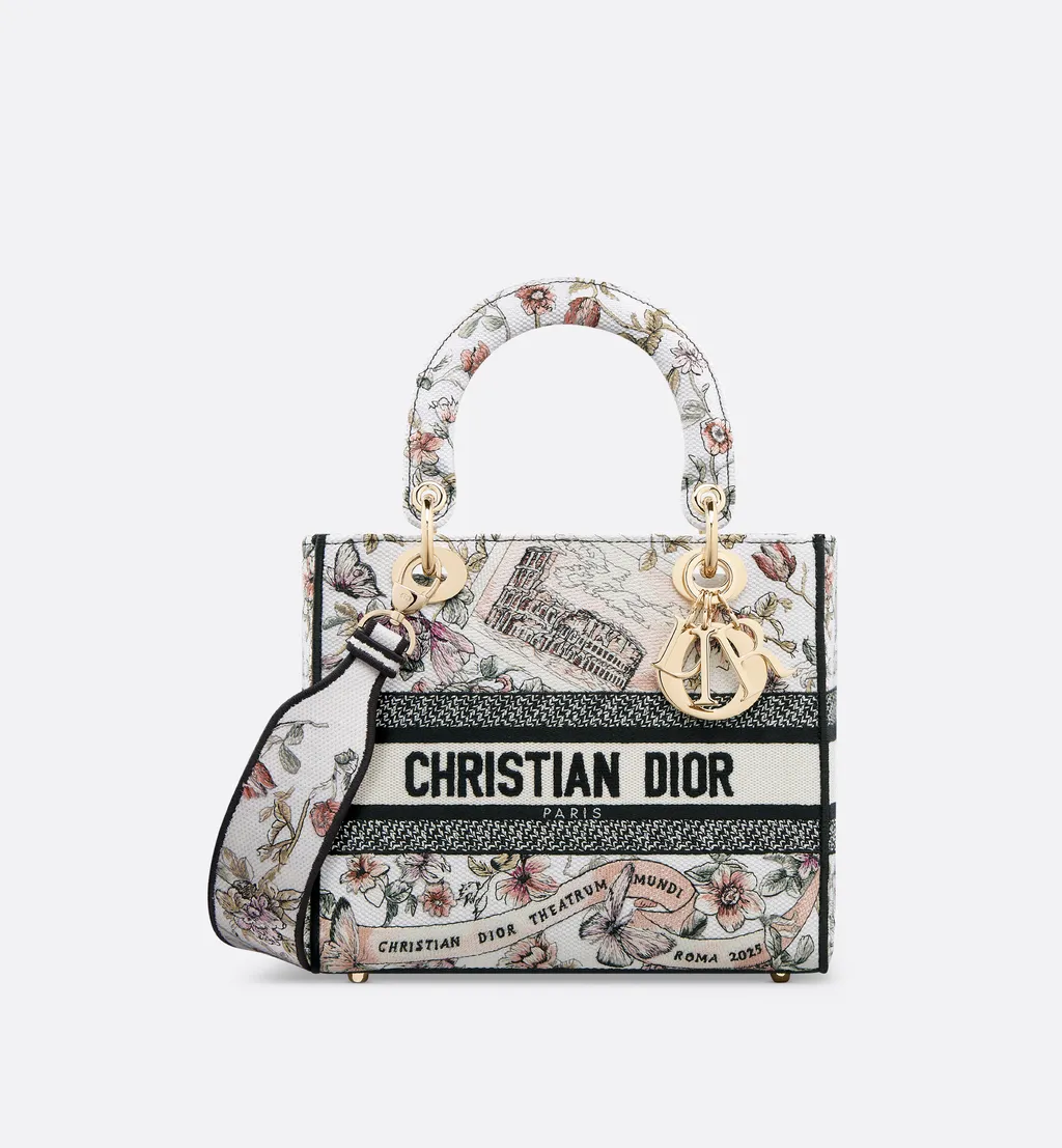 DescriptionCotton, technical fabric and calfskin bag with pietro ruffo's pink souvenir de rome motif. Features a christian dior paris signature on the front and d.i.o.r. Charms in pale gold-finish metal. Includes a wide removable strap, interior zip pocket, and large slip pocket.