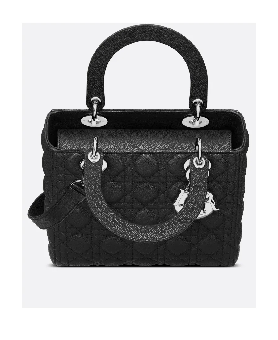DescriptionThe medium lady dior handbag embodies dior's insight into elegance and beauty. Made of black grain cowhide leather, it features a quilted rattan checkered finish and a silver-finished metal "d.i.o.r." charm. It has a medium size, a detachable leather shoulder strap, and an internal zipper pocket and large patch pocket. It is compatible with other embroidered shoulder straps and includes a dust bag.