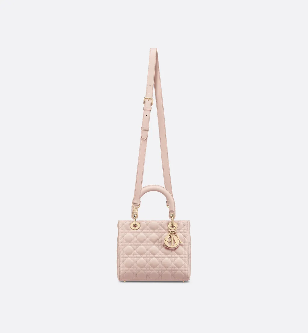 DescriptionThe medium lady dior bag is crafted from powder pink lambskin with cannage stitching. It features pale gold-finish metal d.i.o.r. Charms and a thin, adjustable, and removable shoulder strap. The interior includes a zip pocket and a large slip pocket.