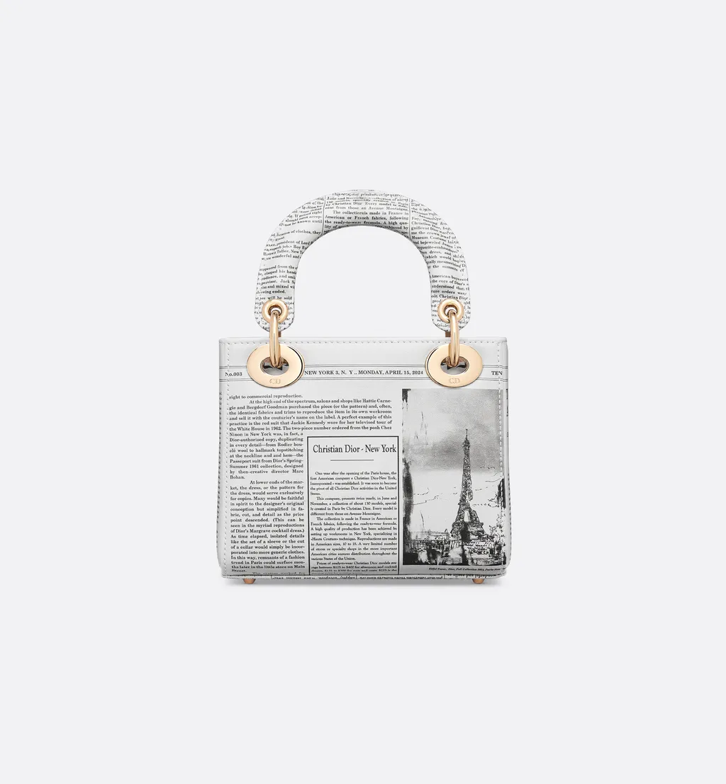 DescriptionThe miniature lady dior bag is made of calfskin with a white and black newspaper print. It features pale gold-finish metal d.i.o.r. Charms and a detachable chain strap for hand or crossbody wear.