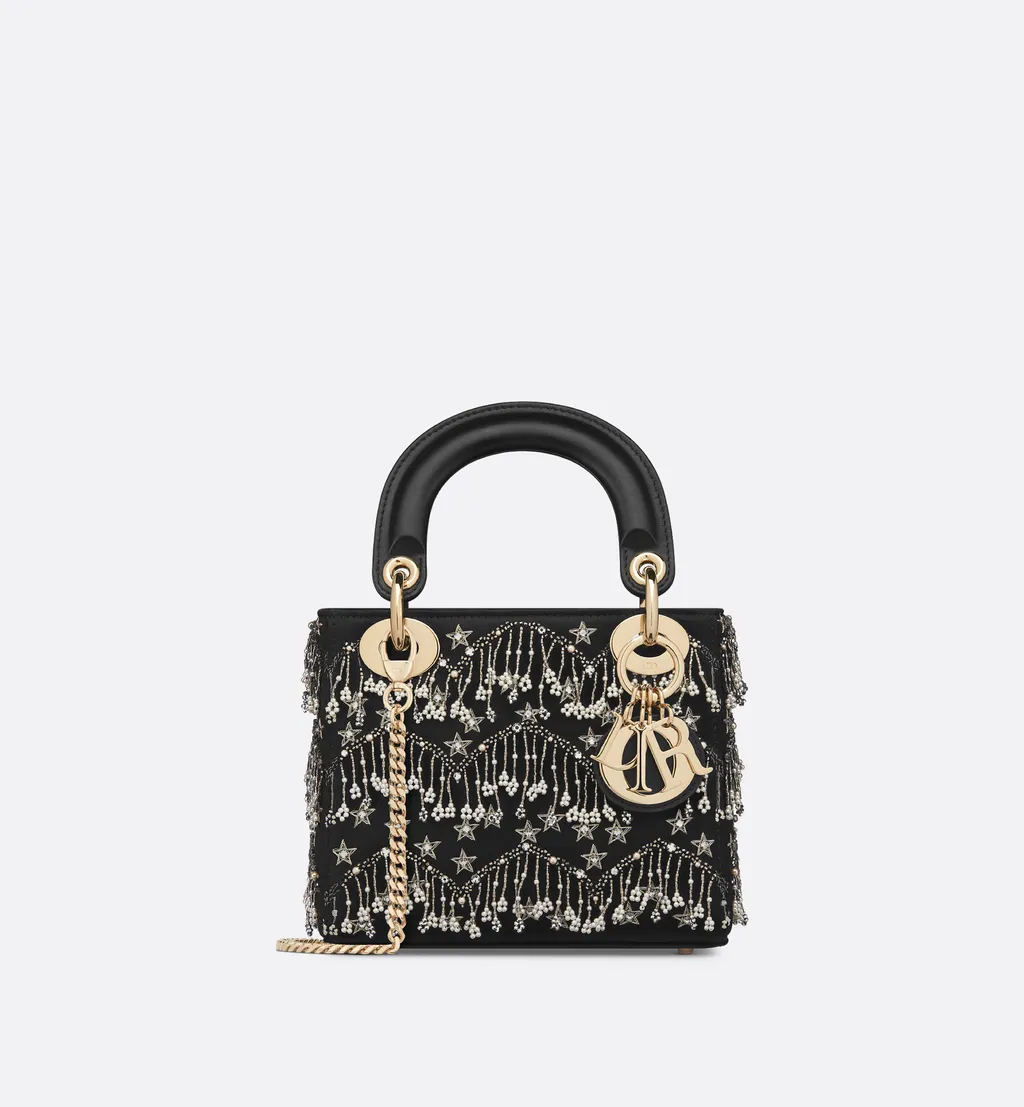 DescriptionThis mini lady dior bag is crafted from black satin embroidered with white resin pearl fringe, silver-tone stars, and strass. It features d.i.o.r. Charms and a detachable chain strap for versatile carrying options.