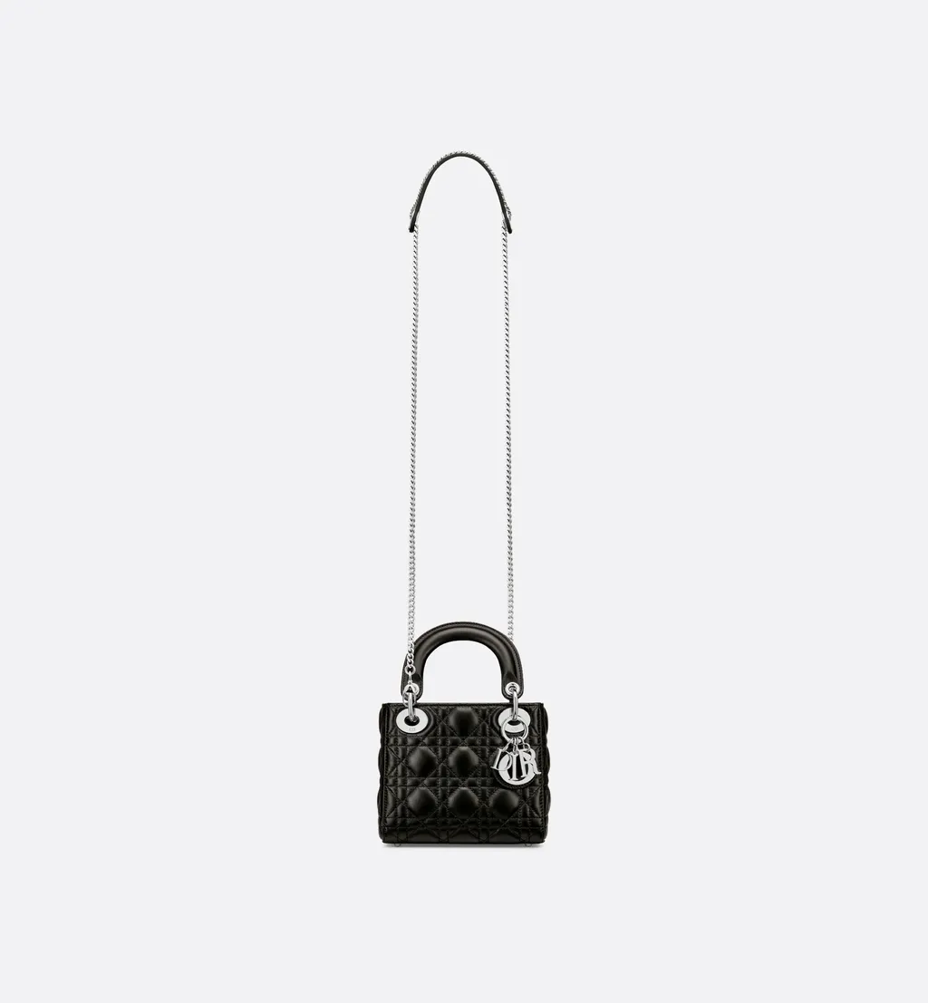 DescriptionThis miniature lady dior bag is crafted from black lambskin with cannage stitching. It features silver-finish d.i.o.r. Charms and a detachable chain shoulder strap. The interior includes a zip pocket.