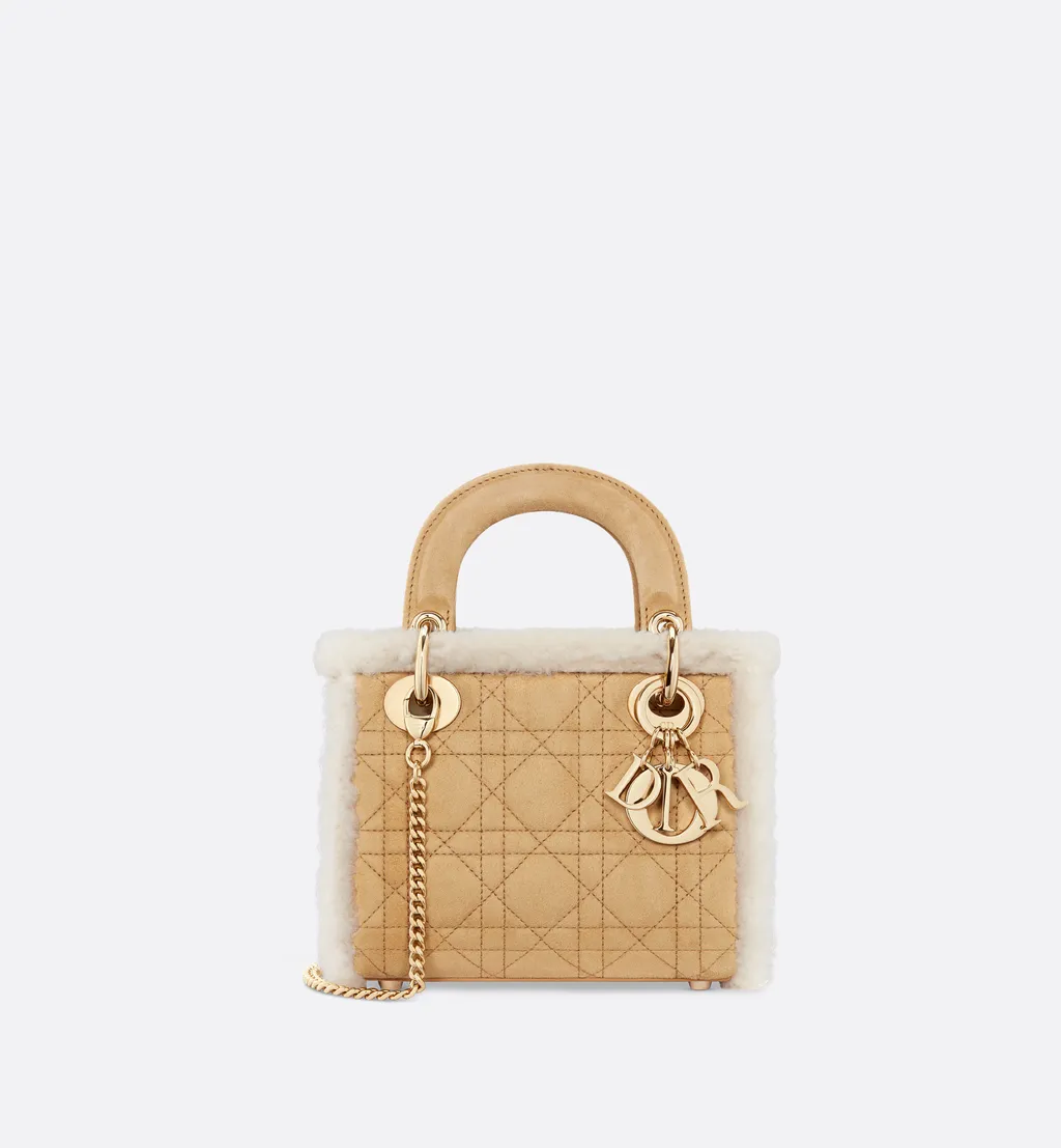 DescriptionThis mini lady dior bag is crafted from beige suede with cannage topstitching and ecru lambswool trim. It features pale gold-finish d.i.o.r. Charms and a detachable chain strap, allowing it to be carried by hand or worn crossbody.