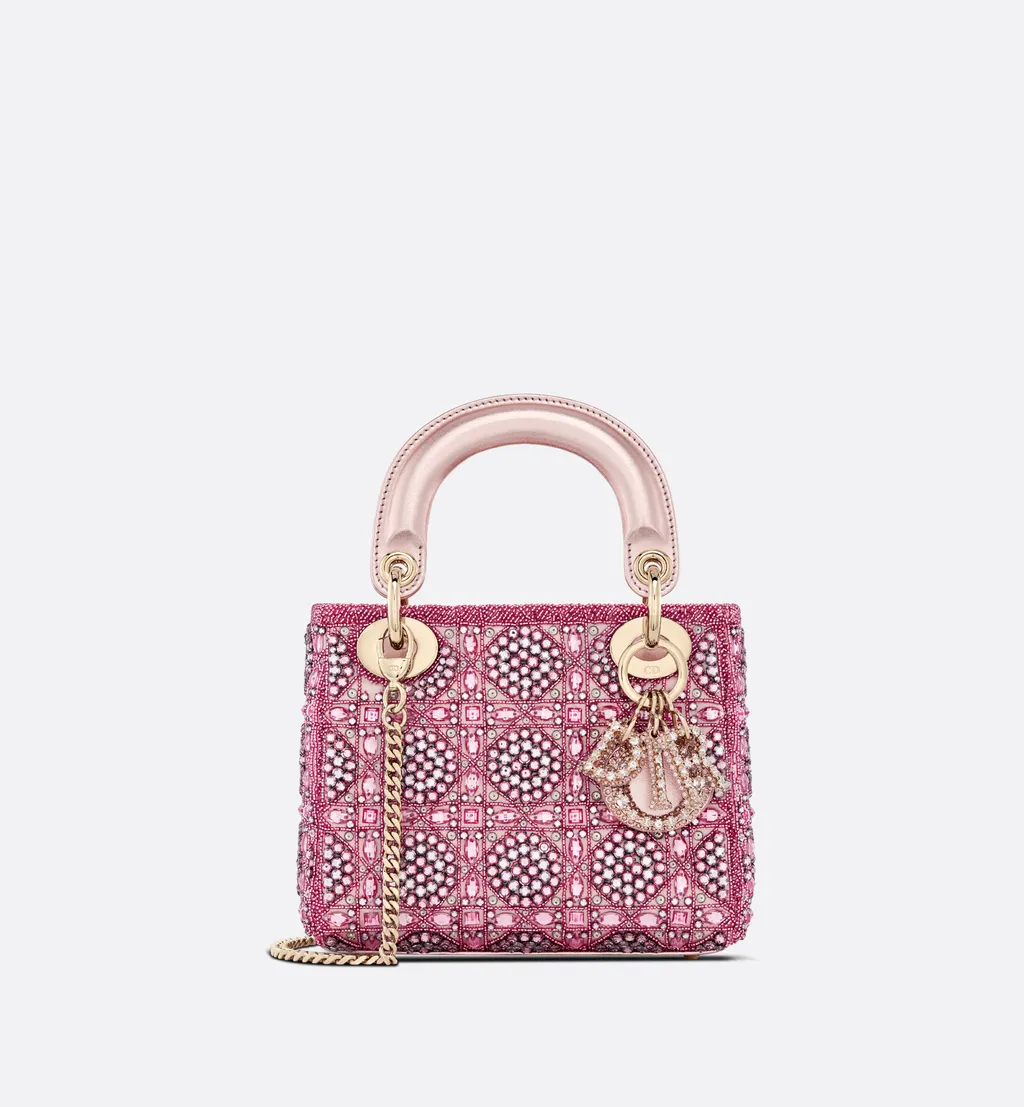 DescriptionRose des vents satin mini bag with cannage design. Features tonal metallic lambskin top handles and pale gold-finish metal d.i.o.r. Charms adorned with white crystals. Includes a detachable chain shoulder strap for hand or crossbody wear.