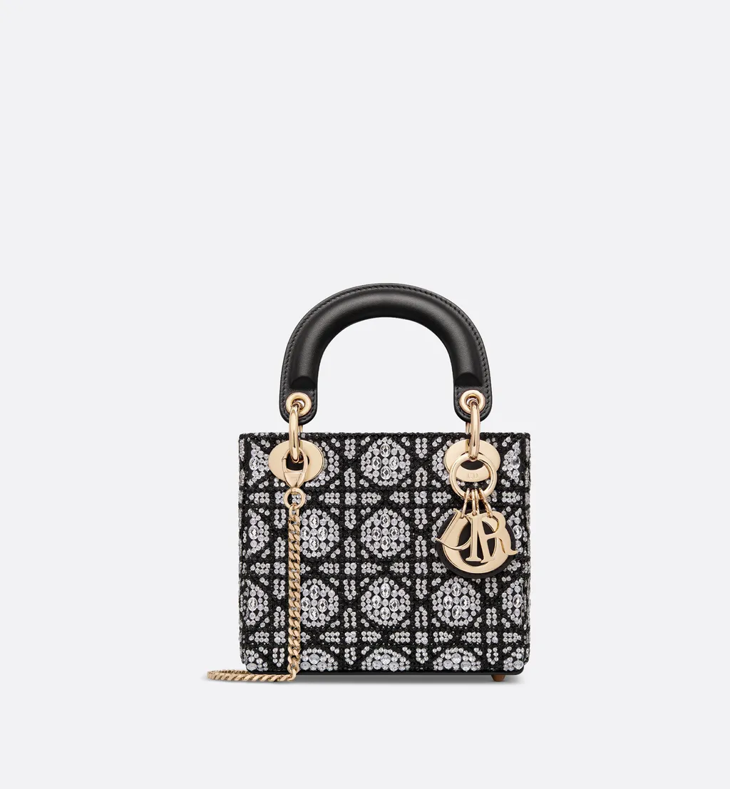 DescriptionMini lady dior bag in black with cannage motif embroidery and silver-tone strass. Features d.i.o.r. Charms, a removable chain strap, and an interior zip pocket. Can be carried by hand or worn crossbody.
