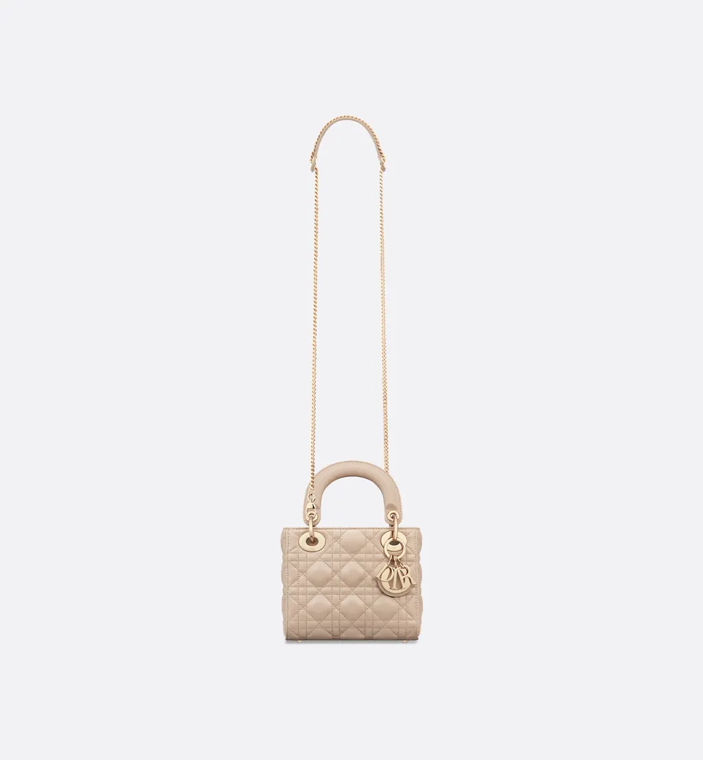 DescriptionThe mini lady dior bag in powder beige lambskin with cannage stitching. Features pale gold-finish metal d.i.o.r. Charms and a detachable chain shoulder strap. Can be carried by hand or worn crossbody.