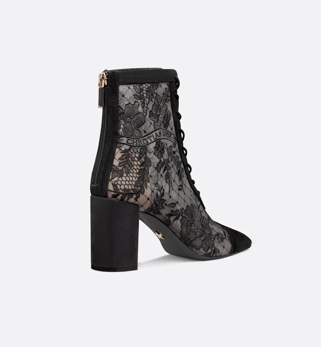 DescriptionTransparent mesh ankle boots with black dior roses embroidery and tonal suede goatskin details. Features a no-tongue design, christian dior signature, and a rear zip closure. Set on an 8-cm block heel.