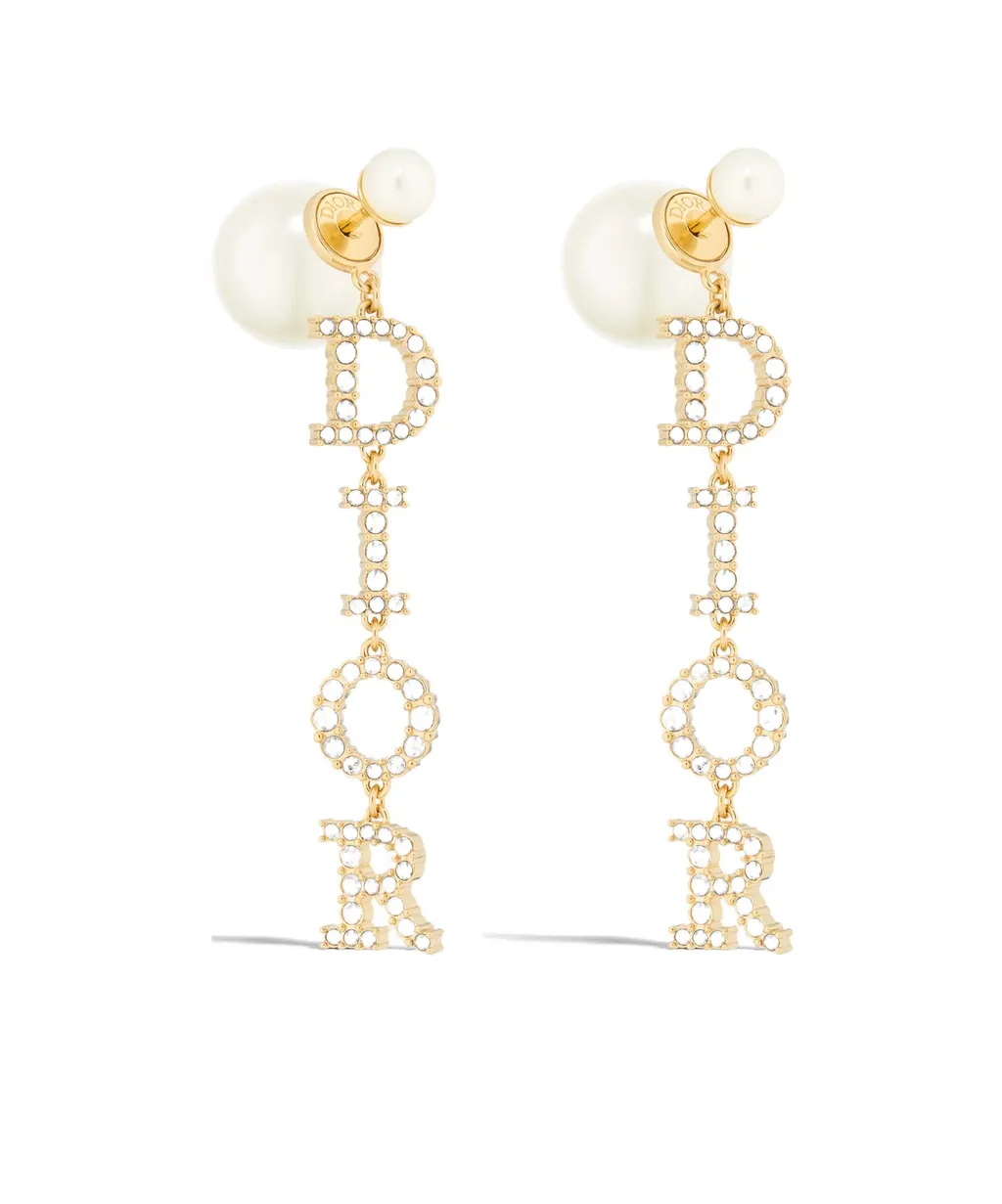 DescriptionThe iconic resin pearls are worn behind the ears, with gold metallic dior lettering hanging from the top. The word dior is set in an exquisite close setting and decorated with silver shining crystals.