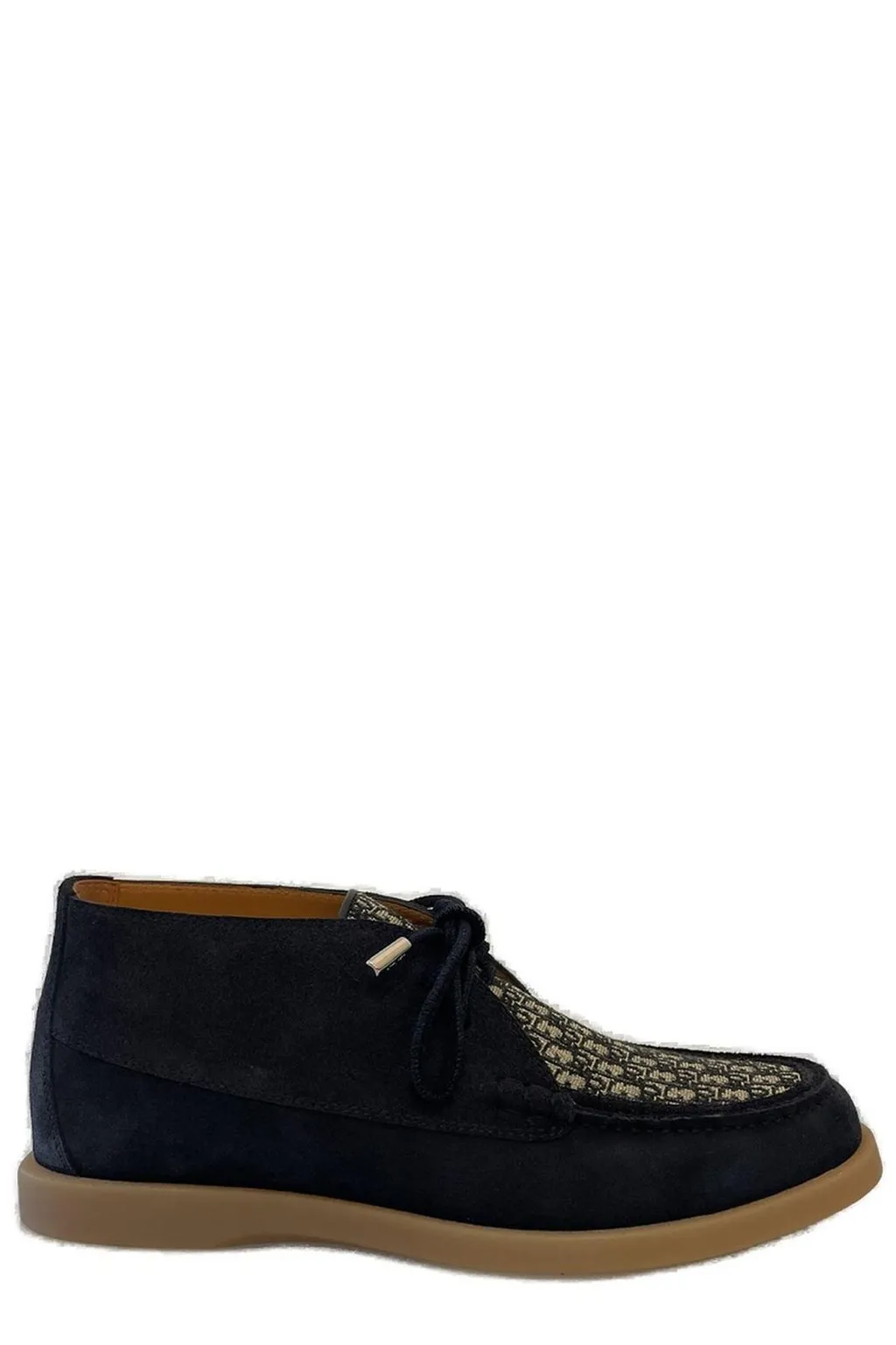 These dior homme chukka boots are crafted from blue suede and feature the dior oblique jacquard canvas. They have a lace-up closure and a rubber sole.