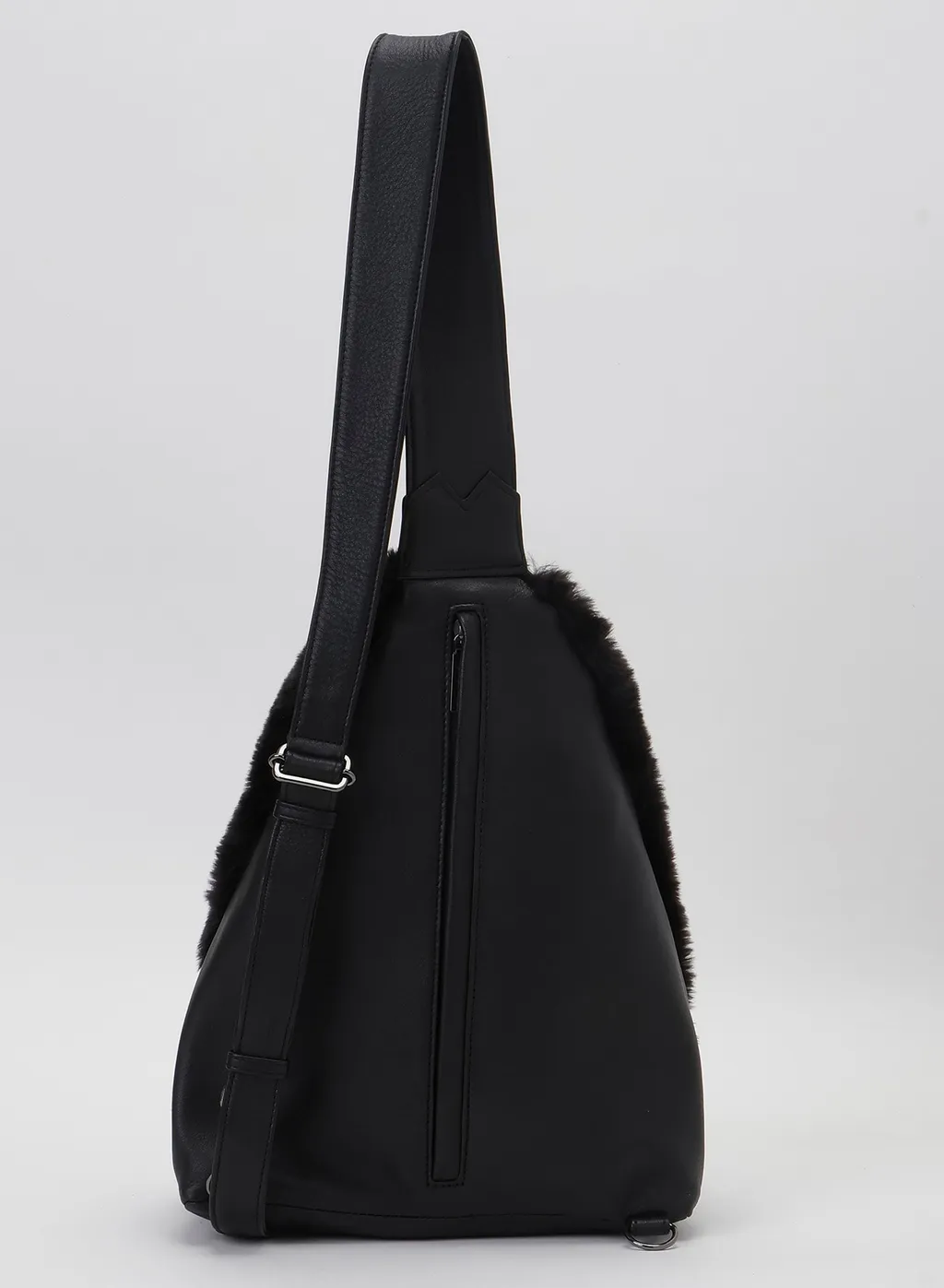 A black discord yohji yamamoto body bag made from acrylic pile and cow leather. This bag features a unique y shape with a zip closure and a single shoulder strap.