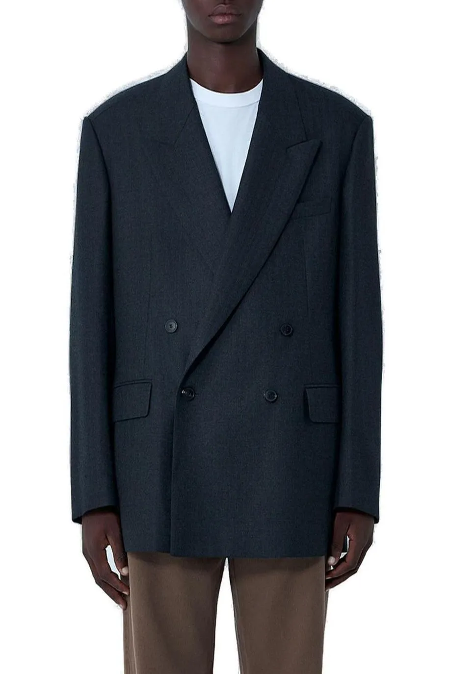 Wool double-breasted blazer with a tailored fit. Features a notched lapel, two-button closure, and two flap pockets.