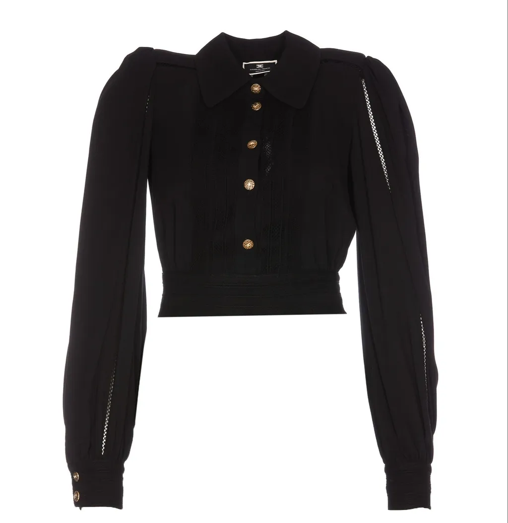 Description100% viscose, 100% cotton. This blouse features a collared neckline, button-down front, and long puff sleeves with buttoned cuffs. It has a cropped silhouette with a cinched waist and a tie closure at the back.
