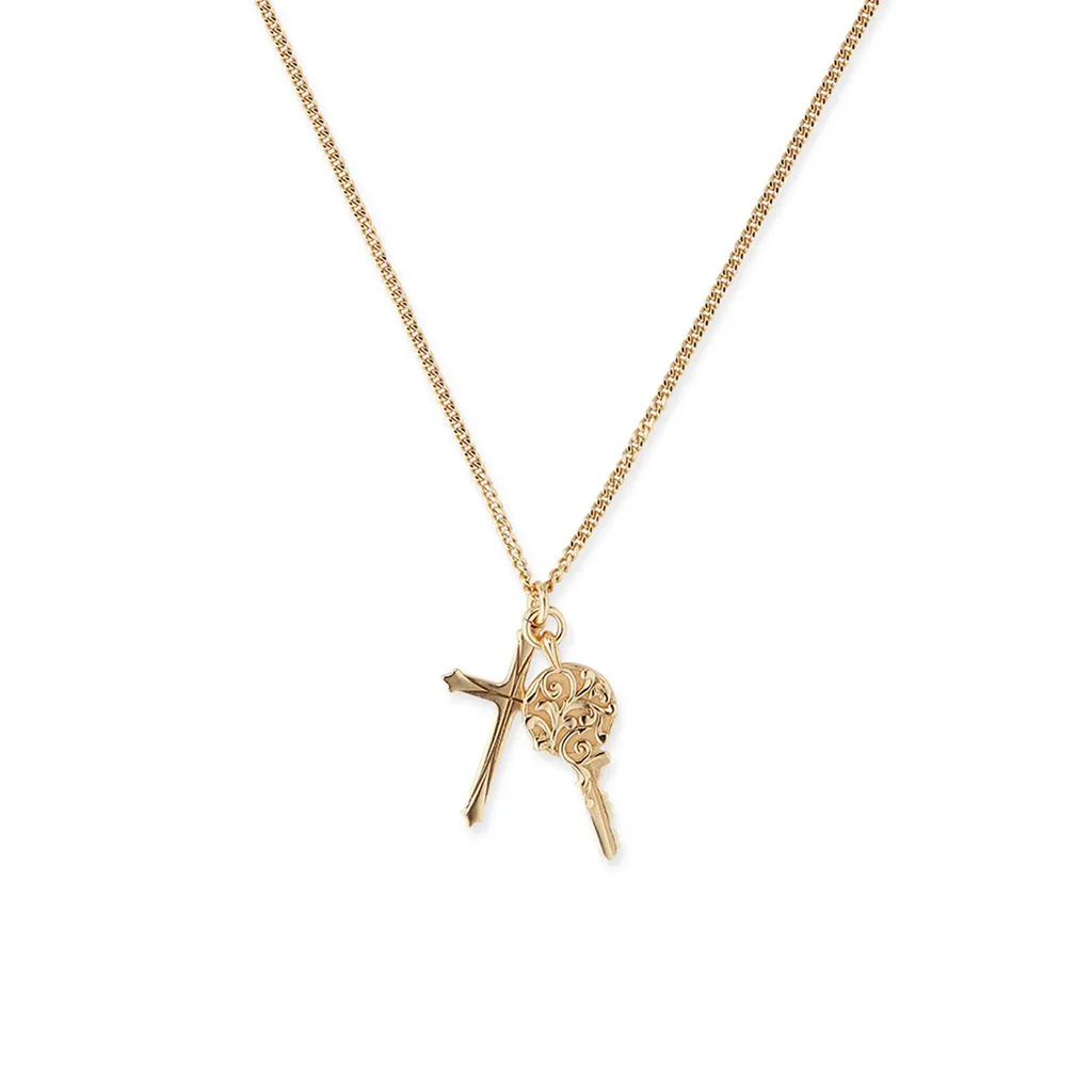 Gold-plated sterling silver necklace. Features a cross and key pendant with intricate detailing. Secured with a clasp closure.