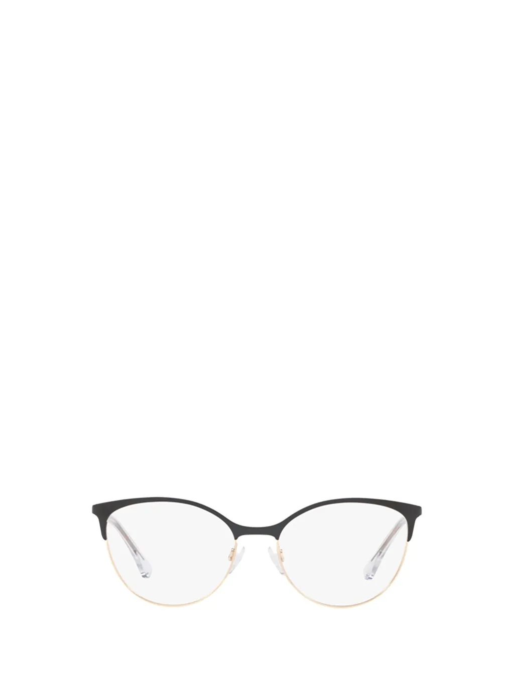 Metal frame with cat-eye shape. Features a black top rim and gold-toned lower rim. Includes adjustable nose pads.