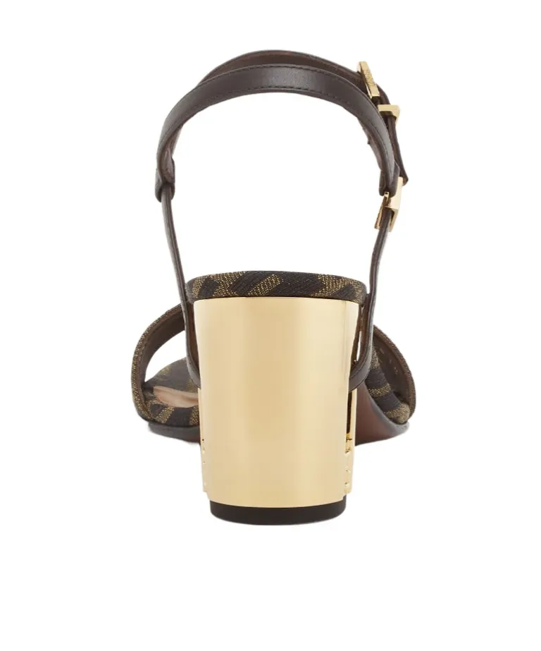 DescriptionSandals with ankle straps, made of jacquard fabric with iconic brown and black ff patterns. Features gold facing heels with hollow details and matching ff patterns, gold facing metal fittings, and an interior made of 100% calfskin. Round toe, chunky heel, heel height: 6.5cm.
