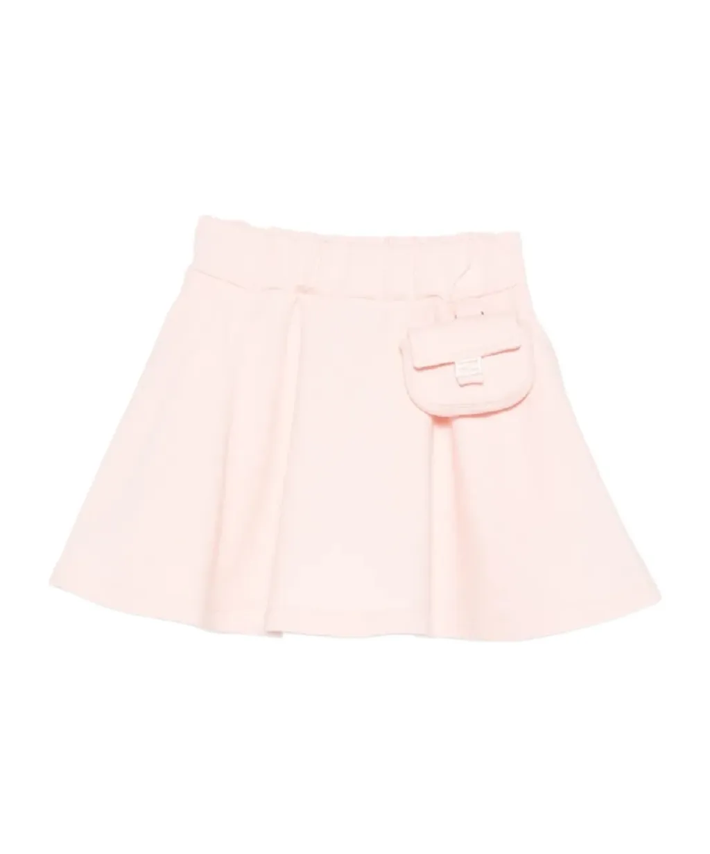 Cotton miniskirt in pink. Features a flared silhouette and a decorative mini bag detail on the waistband.