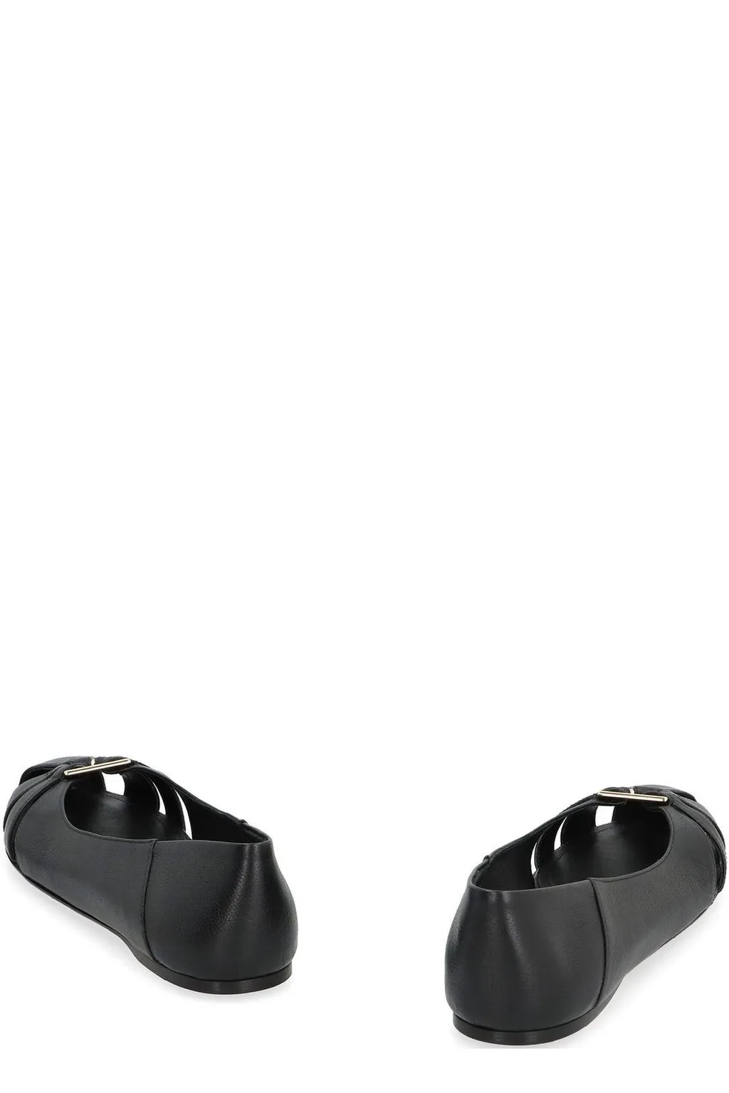 Black leather ballet flats with a pointed toe and a cutout design across the vamp. The cutout features thin straps that cross over and are secured with a small gold-tone buckle. The sole is flat and the heel is low.