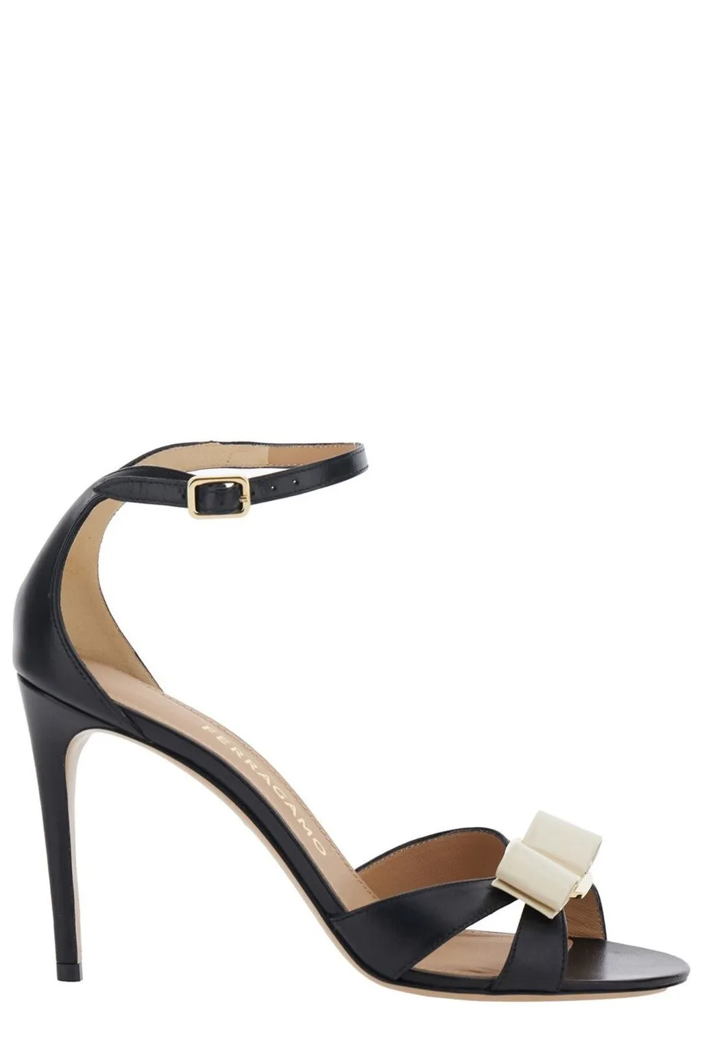 Open-toe heeled sandals with an ankle strap. Features a signature vara bow detail on the vamp. The heel is stiletto style.