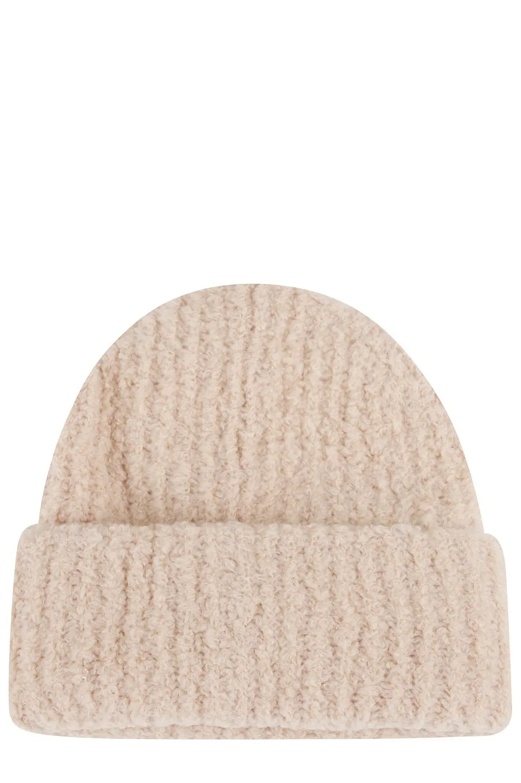 A ribbed knit beanie with a folded brim. The material has a slightly fuzzy texture.