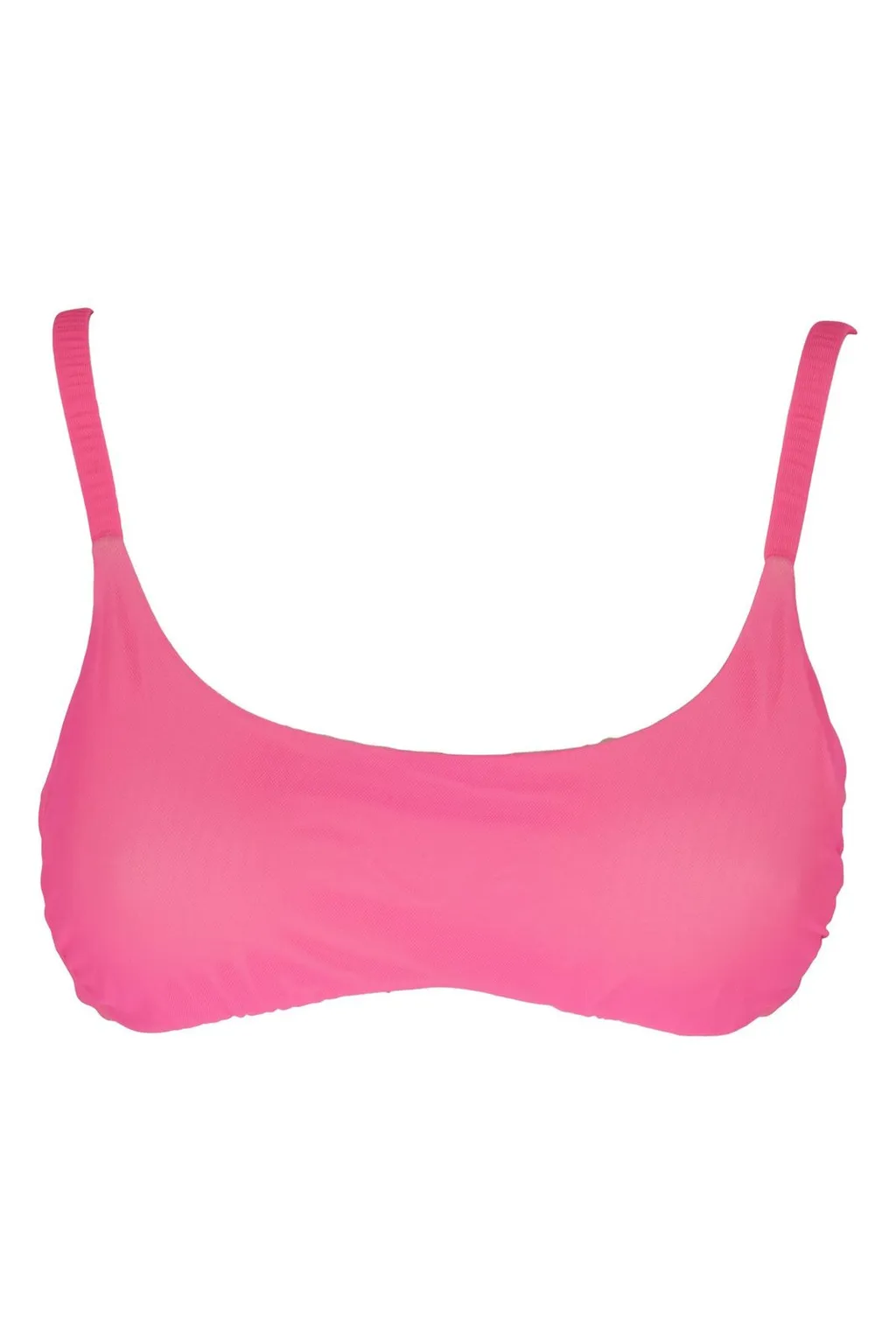 A bright pink bikini top with a scoop neckline and thin shoulder straps. The back features a clasp closure.