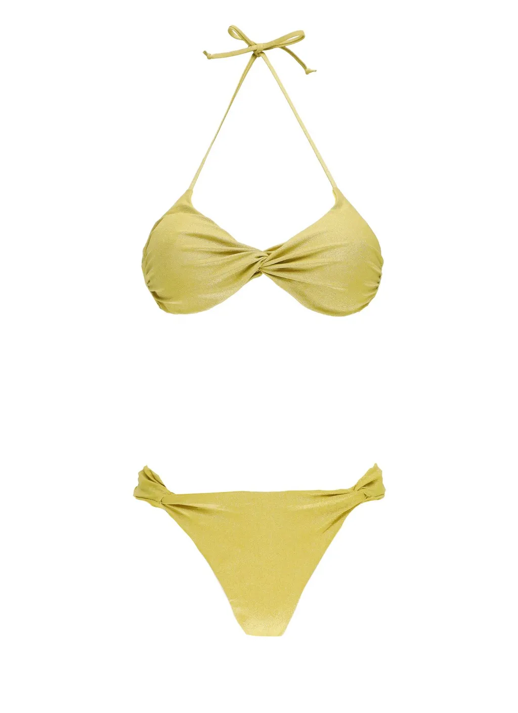 A two-piece bikini set featuring a halter-neck bikini top with a twisted front detail and a matching bikini bottom with twisted side details.