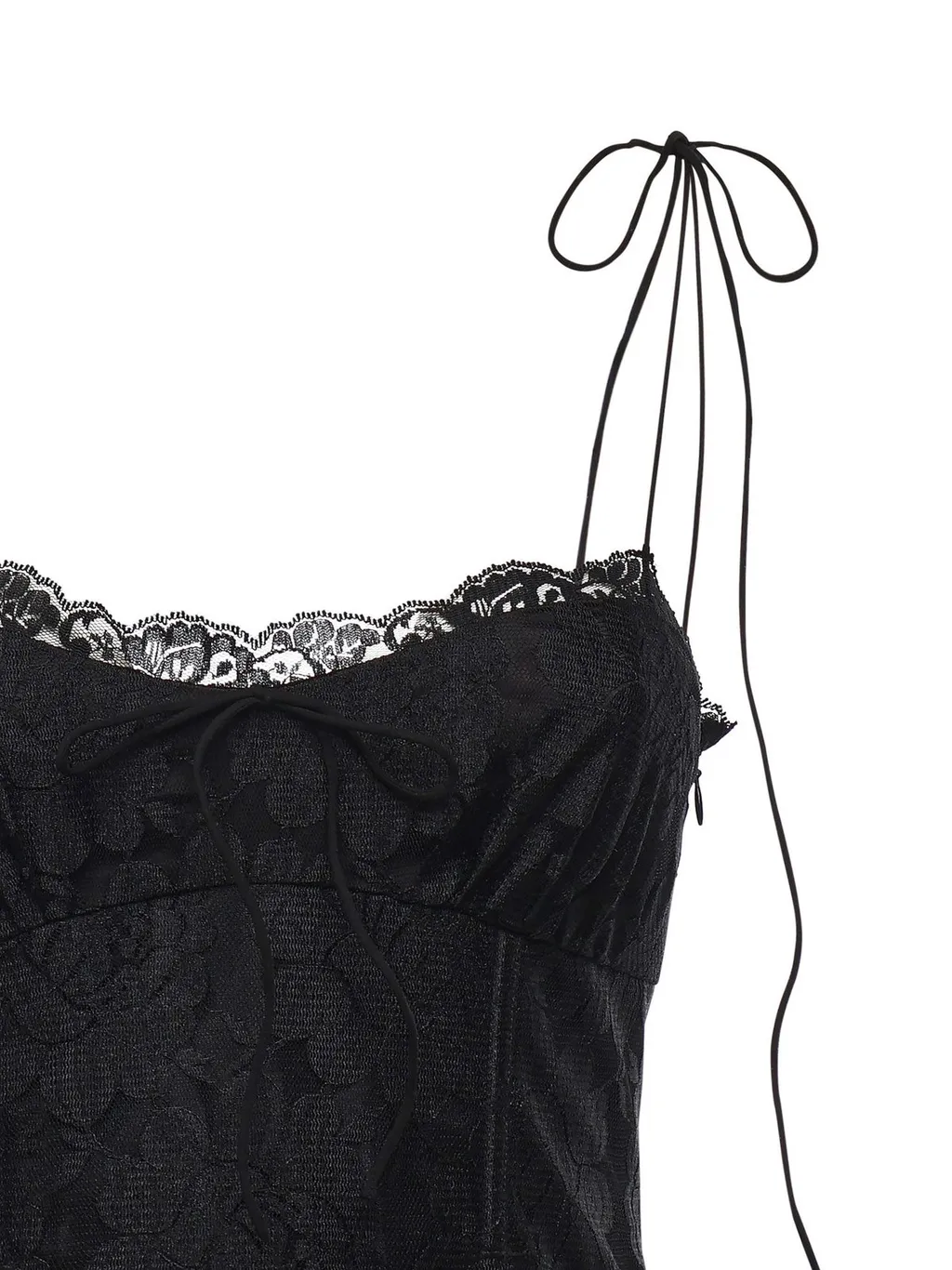 DescriptionA black lace maxi dress with a fitted bodice and a flowing skirt. It features adjustable spaghetti straps with tie details at the shoulders and a delicate lace trim along the neckline. The dress has a sheer lace overlay with a floral pattern, creating a semi-transparent effect.
