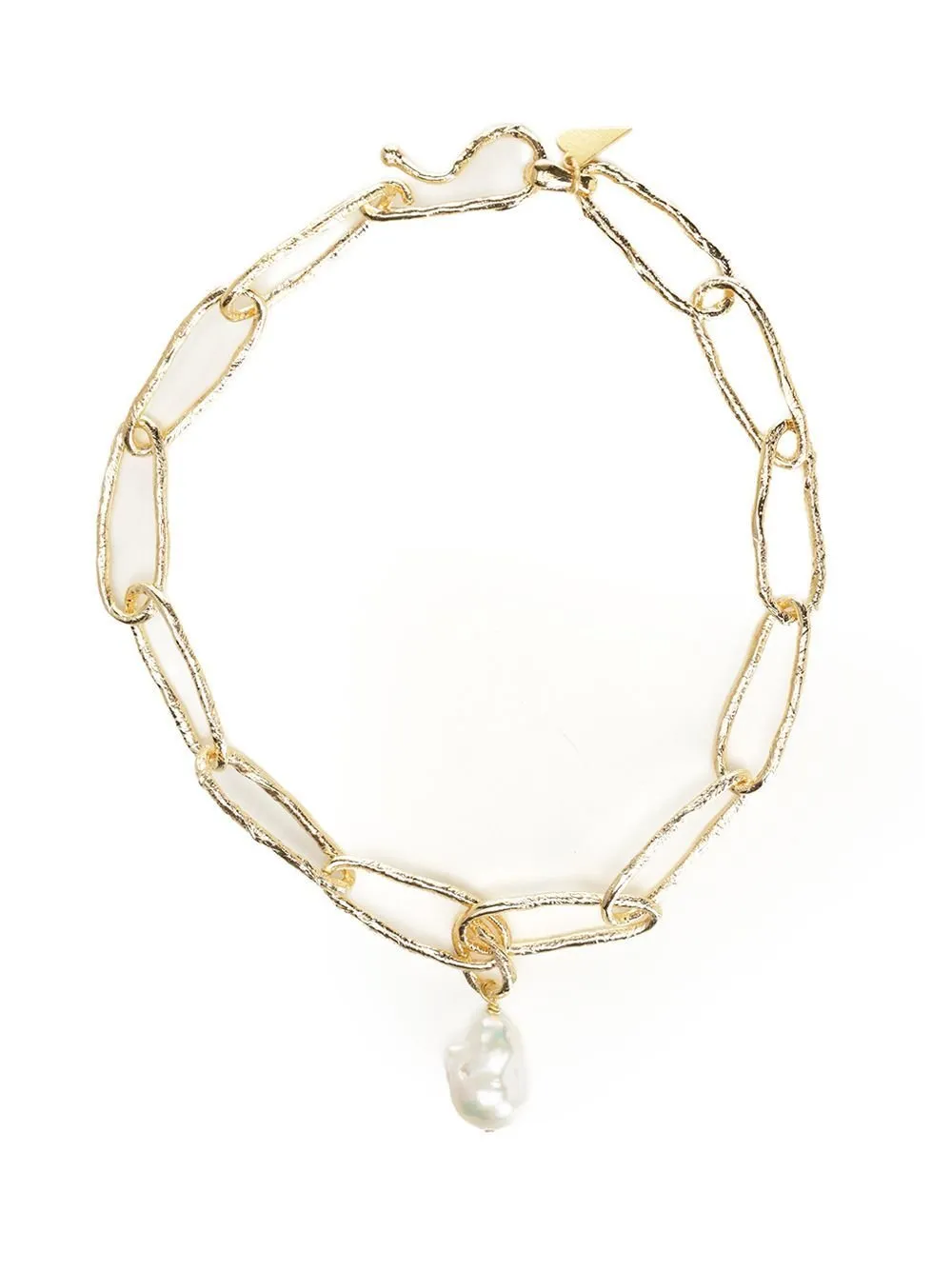 A chunky, gold-tone metal chain necklace featuring irregular, textured links. A single, baroque-style pearl pendant hangs from the center of the necklace.