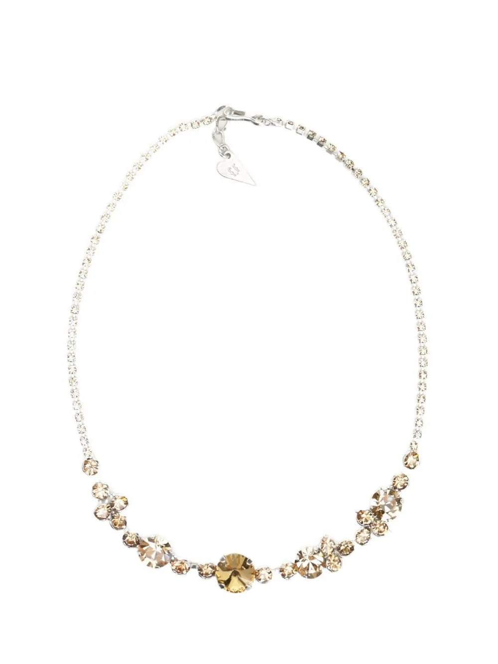 DescriptionA delicate choker necklace featuring a central, larger gold-toned crystal surrounded by smaller, clear and champagne-toned crystals. The chain is made of small, silver-toned links. The necklace has an adjustable clasp for a customizable fit.