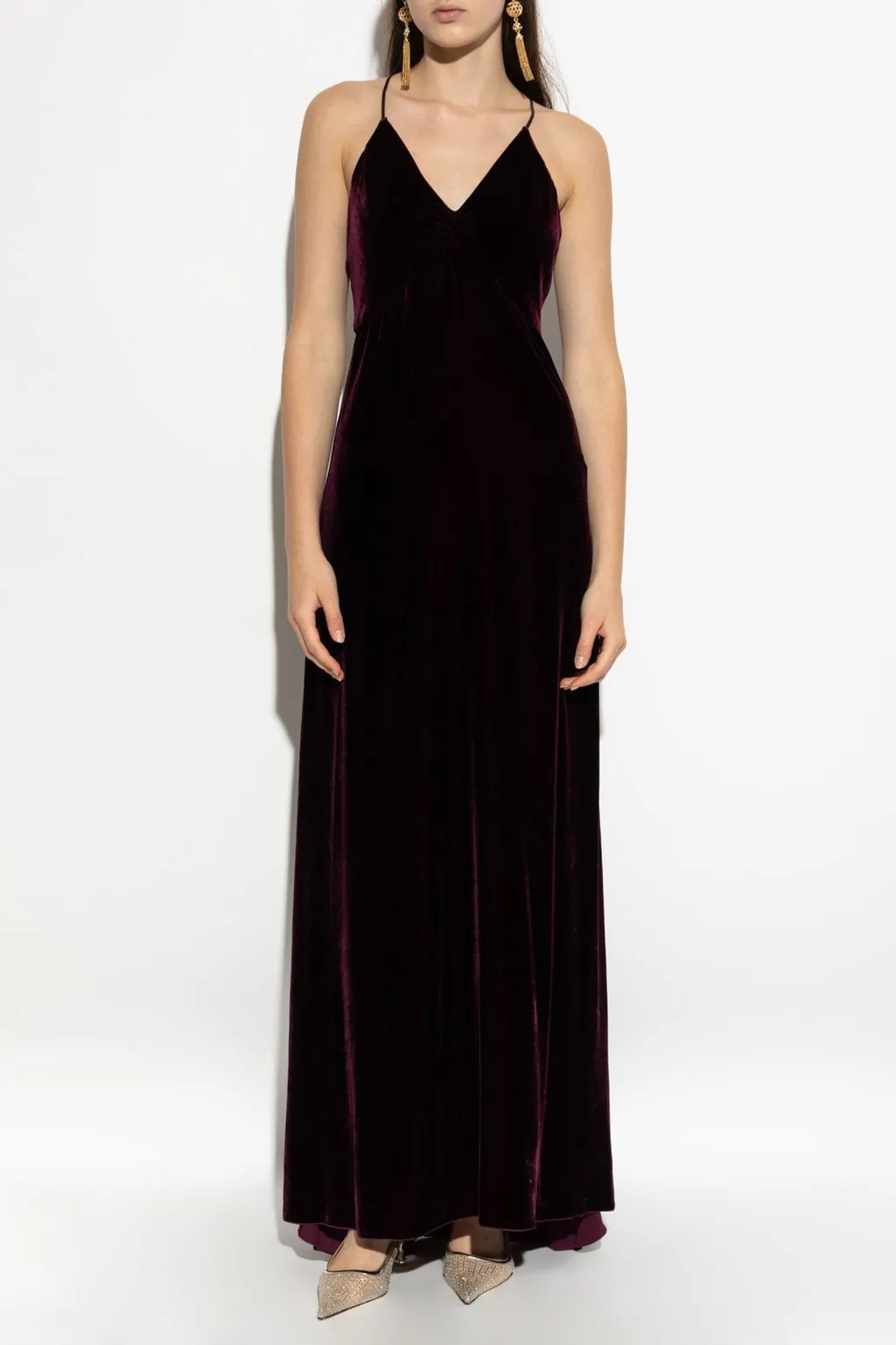 A long, sleeveless velvet dress with thin, criss-cross straps on the back and a v-neckline.