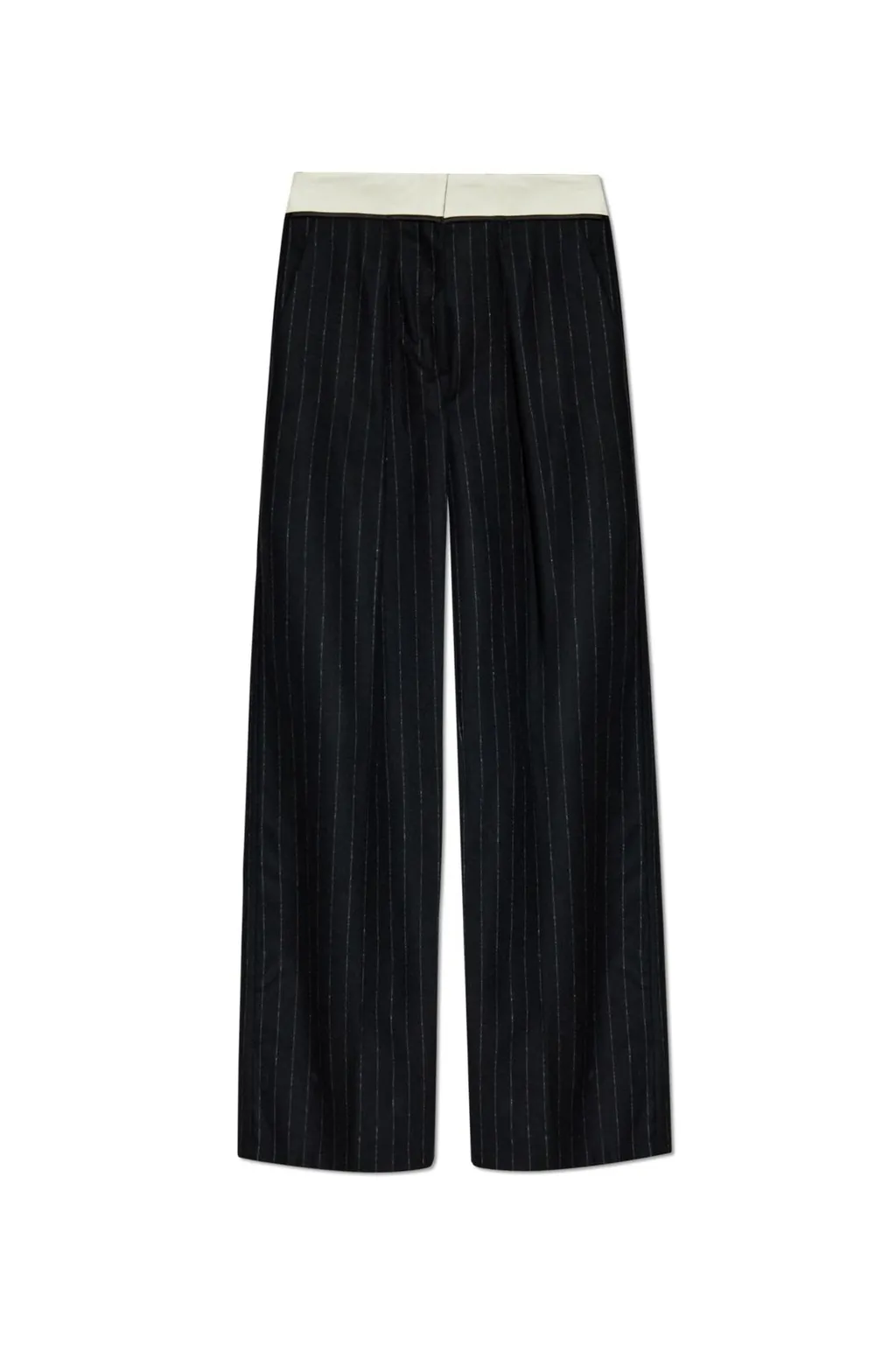 High-waisted trousers with a wide-leg silhouette. Features a contrasting waistband and a pinstripe pattern throughout. Pleats are present on the front.