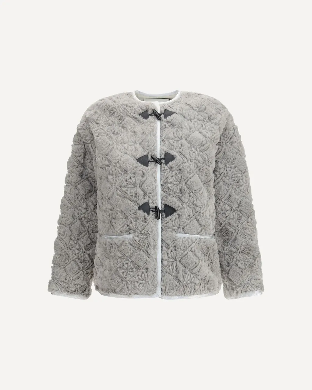 A grey quilted faux fur jacket with a round neckline and toggle closures. It features two front pockets with white trim and a slightly textured, all-over diamond pattern.