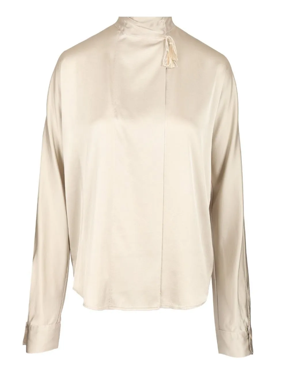 A long-sleeved silk blouse with a high neckline and a draped front. Features a subtle tassel detail at the neckline and buttoned cuffs.