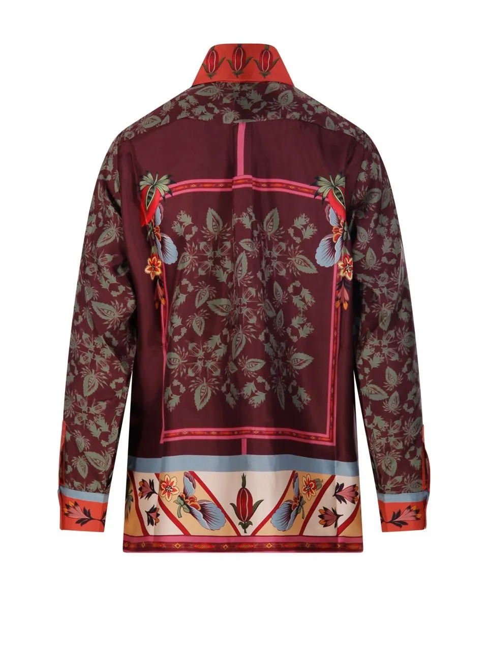 DescriptionA long-sleeved button-up shirt with a spread collar. The shirt features a rich brown base with intricate floral and botanical prints in shades of red, blue, green, and yellow. The print is concentrated on the front panel and cuffs, with a more subtle, all-over botanical pattern on the sleeves and back.