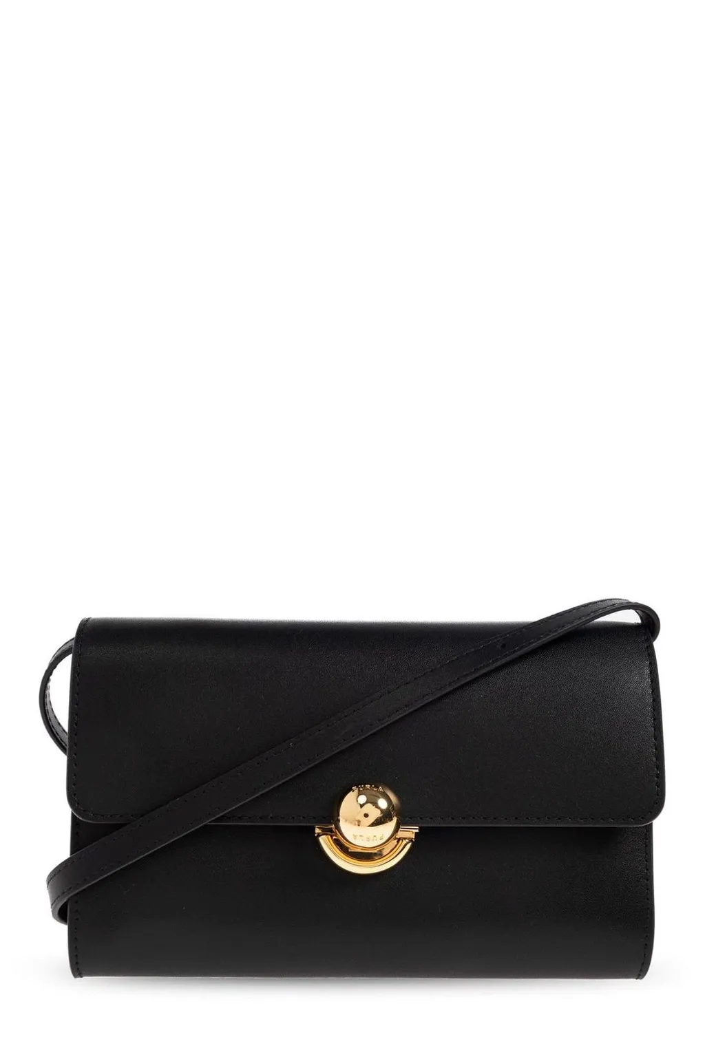 A black crossbody bag with a flap closure and a spherical gold-tone clasp. It has a thin, adjustable strap and a minimalist design.