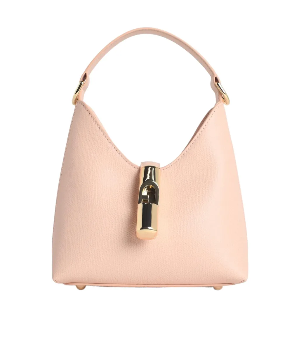 DescriptionCalfskin handbag with a fixed top handle and adjustable removable shoulder straps. Features metal accessories, the arco furla logo, a zippered pocket, and fabric lining. Includes metal foot pegs on the bottom.