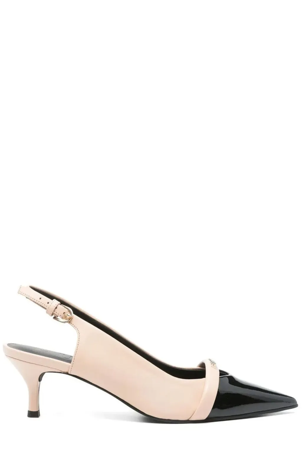 Pointed-toe slingback pumps with a kitten heel. Features a contrasting black patent leather toe and a beige upper with a decorative strap across the vamp. Adjustable ankle strap with a buckle closure.
