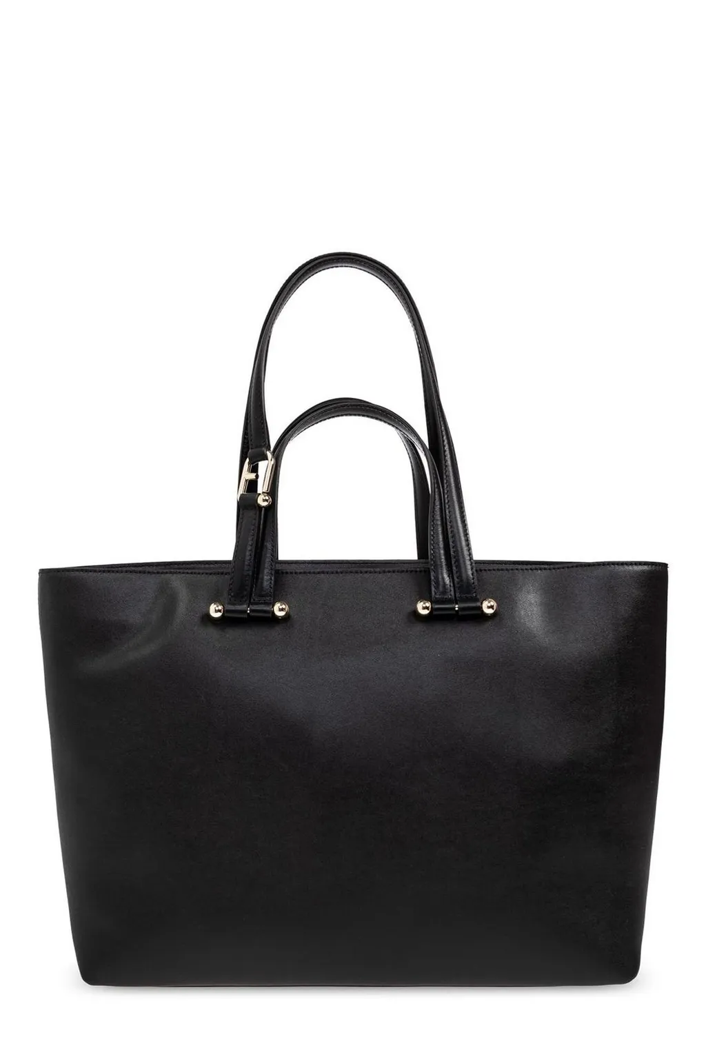 A classic black tote bag with two top handles. The bag features a structured silhouette and gold-tone hardware accents on the handle attachments.