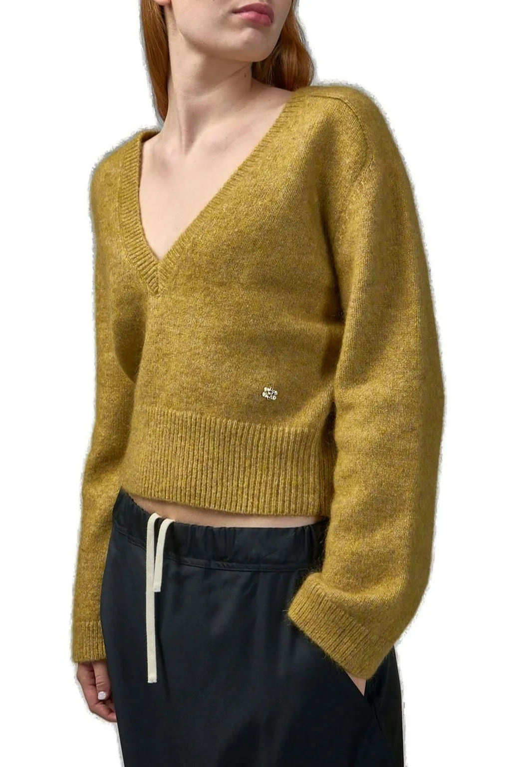 A cropped sweater with a deep v-neckline and long sleeves. It features a ribbed hem and cuffs. A small decorative emblem is present on the left chest.