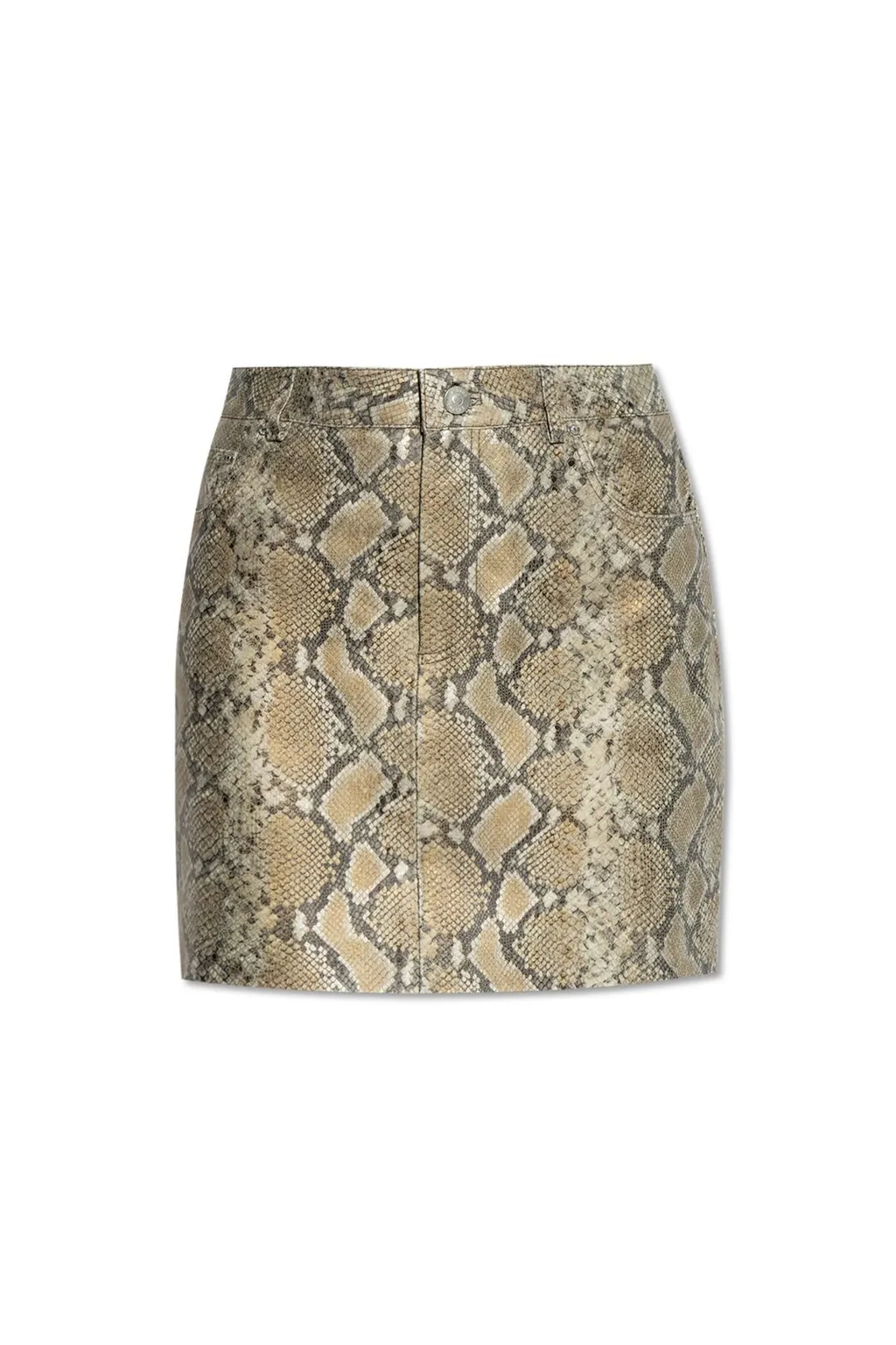 A mini skirt with a snakeskin print. It features a classic five-pocket design and a button and zip closure.