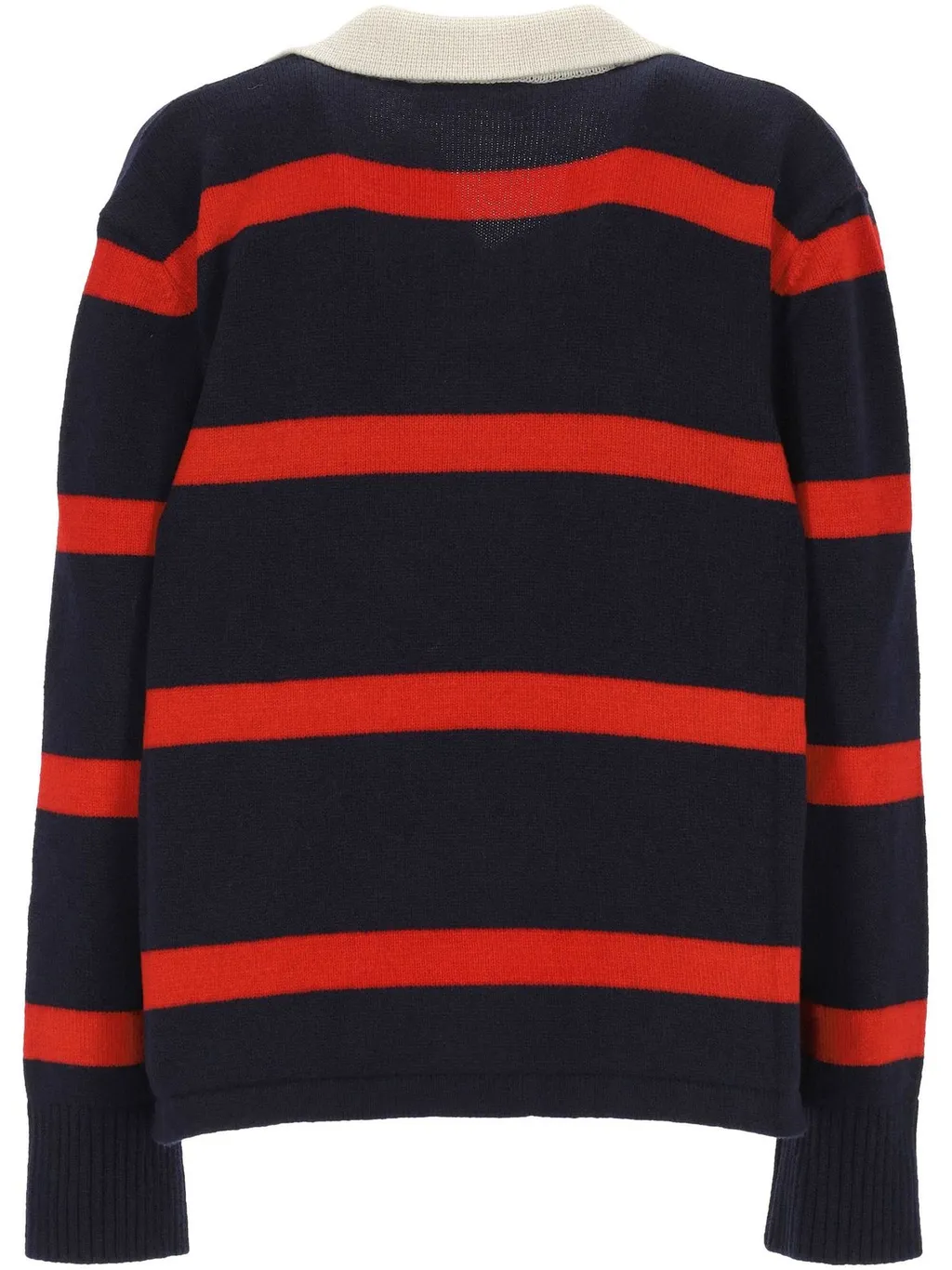 A long-sleeved knit polo shirt with a white collar and a navy blue base featuring horizontal red stripes. It has a v-neck opening and a small embroidered text detail on the chest. The cuffs and hem are ribbed.