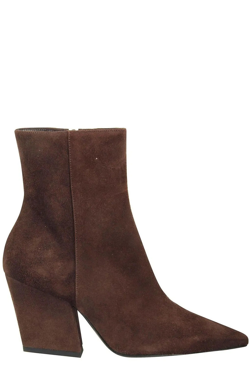 A pair of brown suede ankle boots with a pointed toe and a block heel. The boots have a side zipper closure.