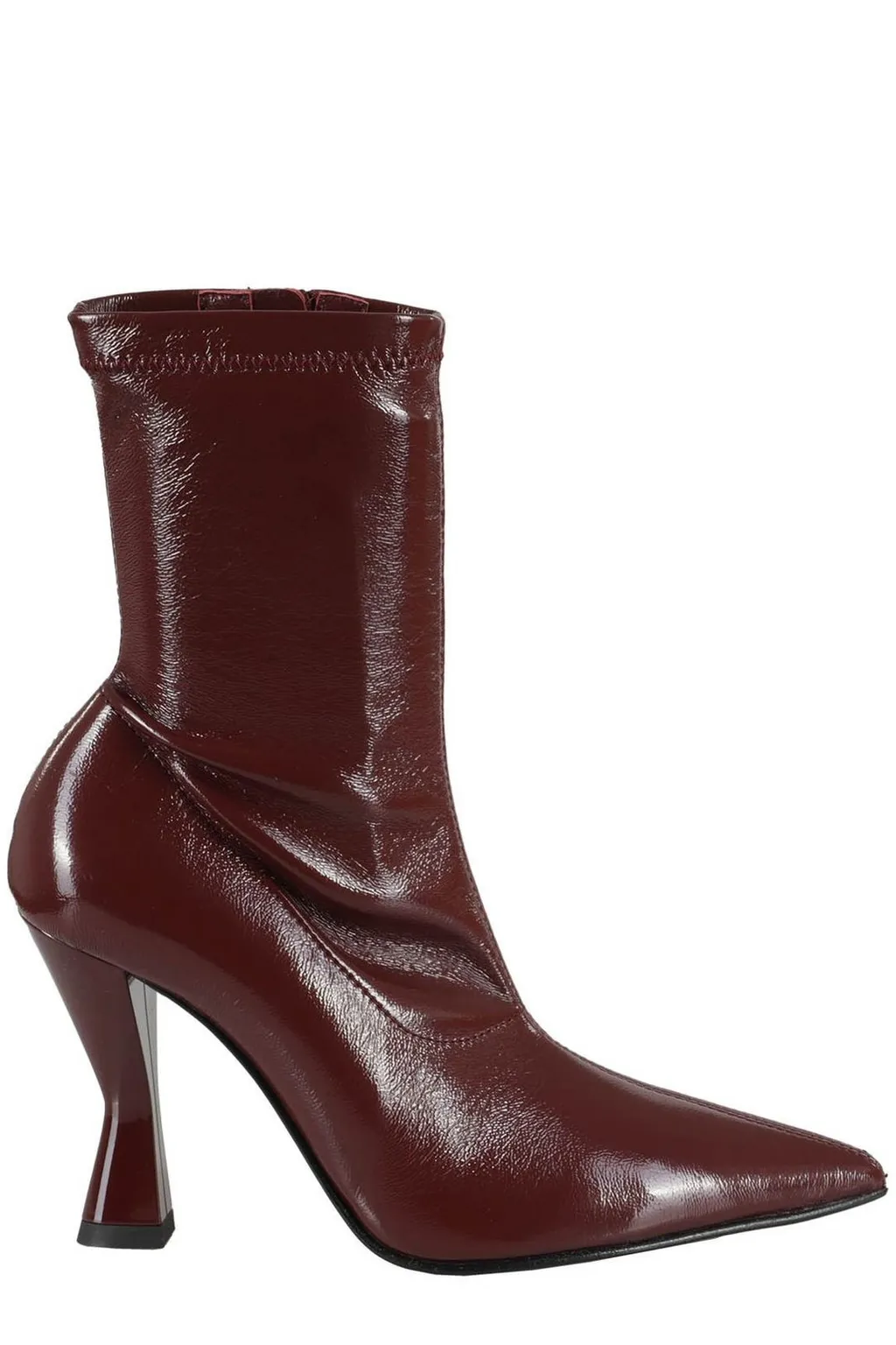 Pointed toe sock boots with a glossy finish and a sculpted heel.