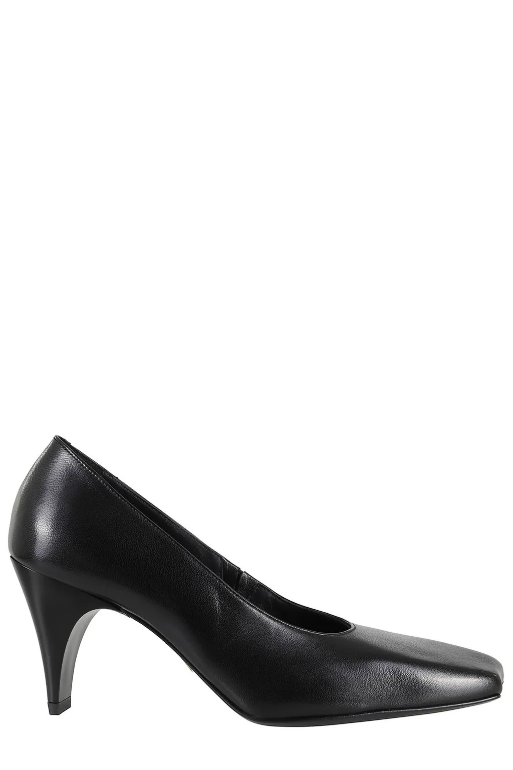 Classic black leather pumps with a square toe and a flared heel. The shoe features a low-cut vamp and a pointed toe, creating a sleek and sophisticated silhouette.