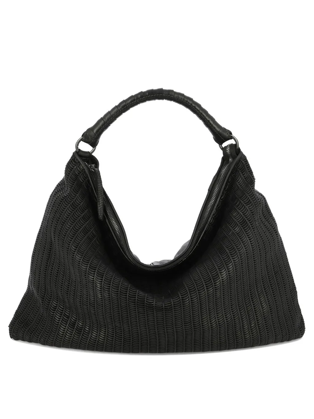 A black hobo bag with a woven texture and a braided handle. It features a zip closure and silver-toned hardware.
